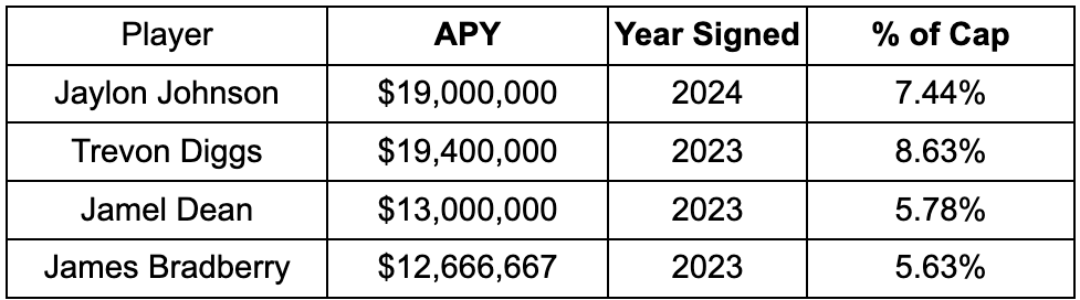 However, the age factor brings Bradberry’s APY closer to Jamel Dean’s than Johnson and Diggs, even though Bradberry doubled Dean’s interceptions and pass break-ups.