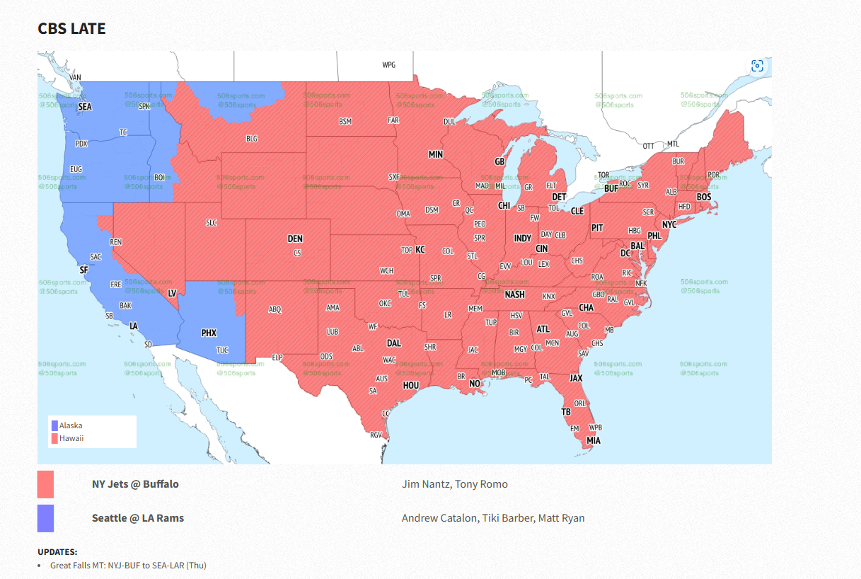 The Bills-Jets game (red) is competing with only one game. the Seattle Seahawks vs. the Los Angeles Rams. Luckily, Buffalo is quite literally dominating the map and taking over the country. While neither team is playing well, it's almost like watching a trainwreck where people just can't keep their eyes off the Bills.