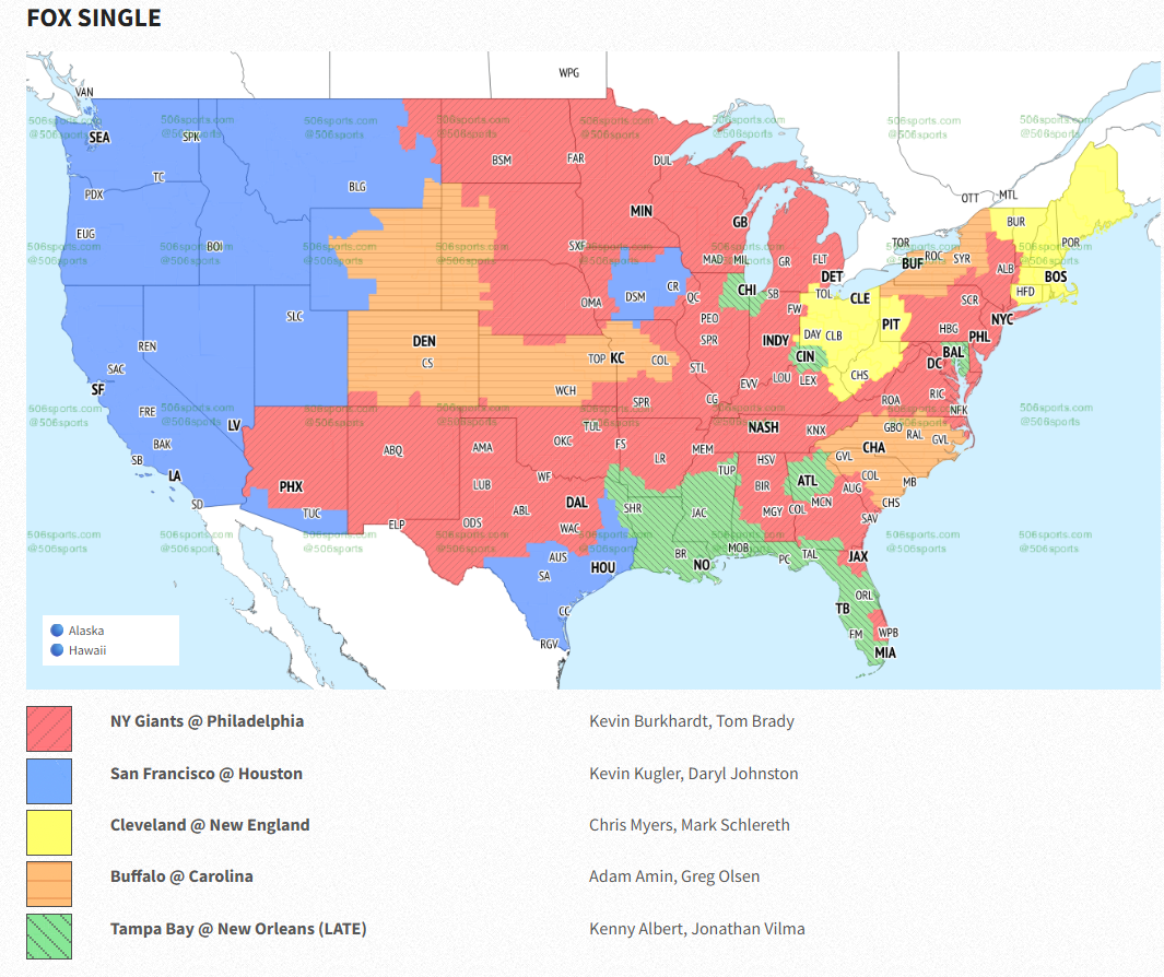 FOX’s slate of games is expansive, with the orange indicating where across the country viewers will be getting the Panthers and Bills game. It’s competing with the New York Giants at the Philadelphia Eagles (red), San Francisco at Houston Texans (blue), and the Cleveland Browns at New England contests (yellow). The late game, Tampa Bay Buccaneers at New Orleans Saints, is shown in green.