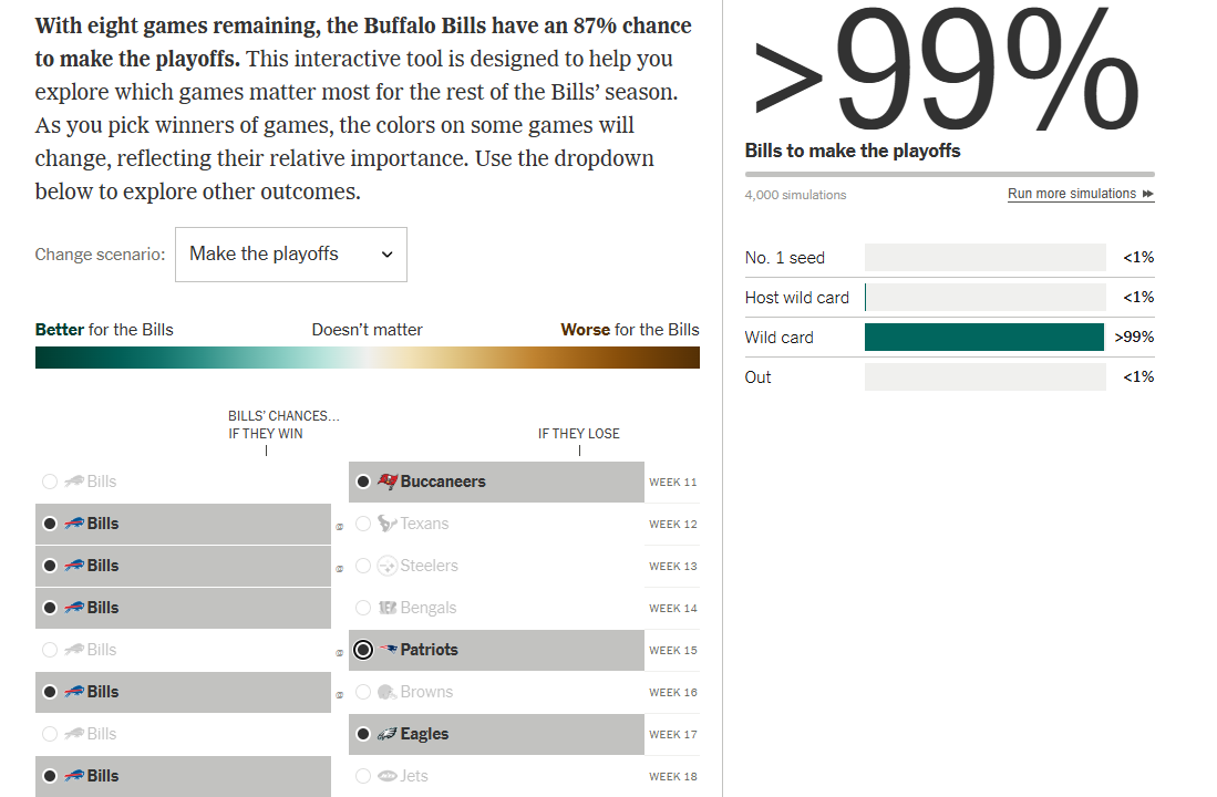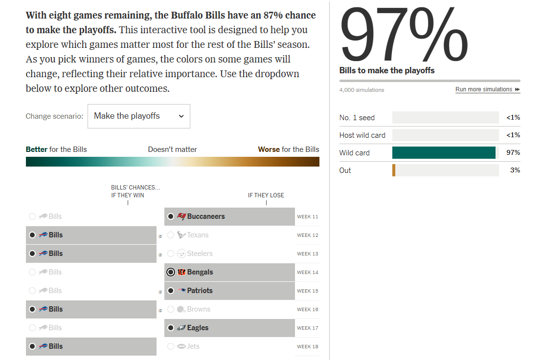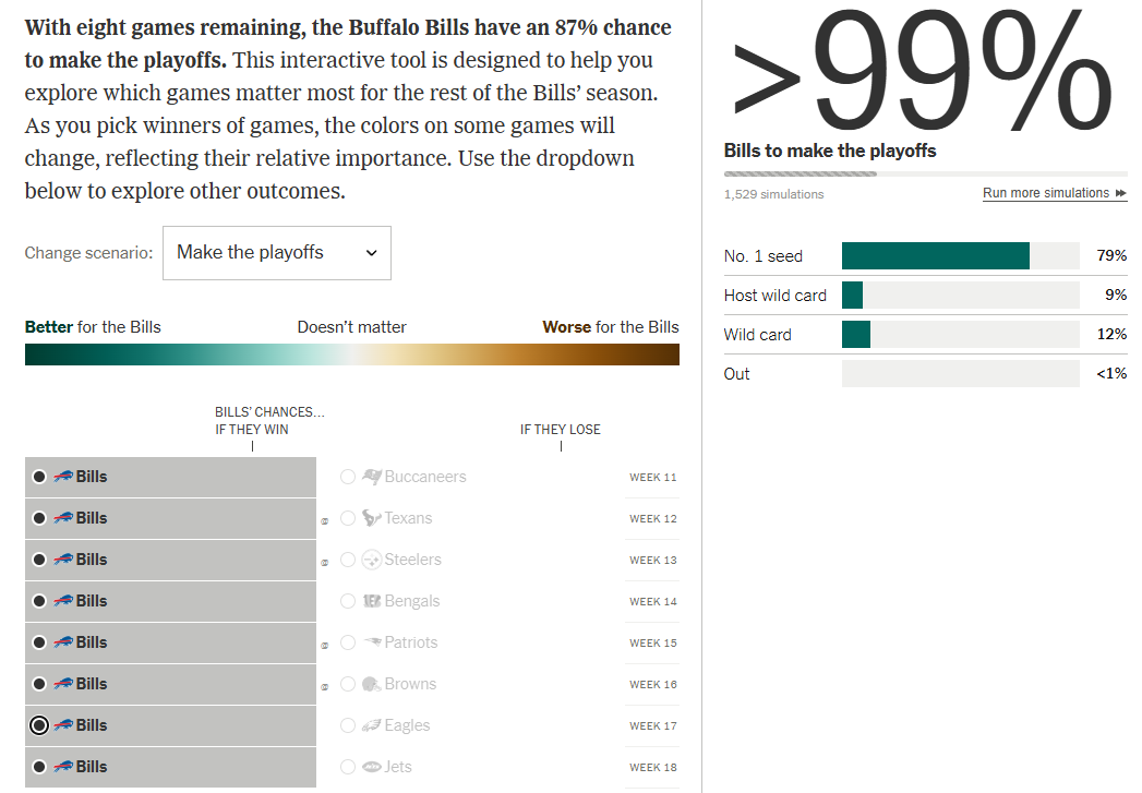 According to the New York Times playoff machine, the Bills currently have an 87% chance to make the playoffs, a 14% chance to win the division, a 6% chance to have a first-round bye, and a 5% chance to win the Super Bowl.