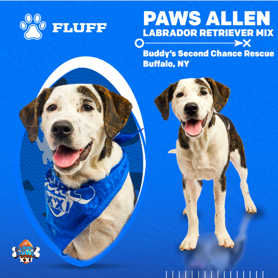 "As a member of Team Fluff, this Labrador Retriever mix comes from Buddy’s Second Chance Rescue in Buffalo, New York. Like his namesake, Paws Allen is known for his incredible arm strength – especially when it comes to tug-of-war! He’s sure to get the crowd cheering on gameday!"