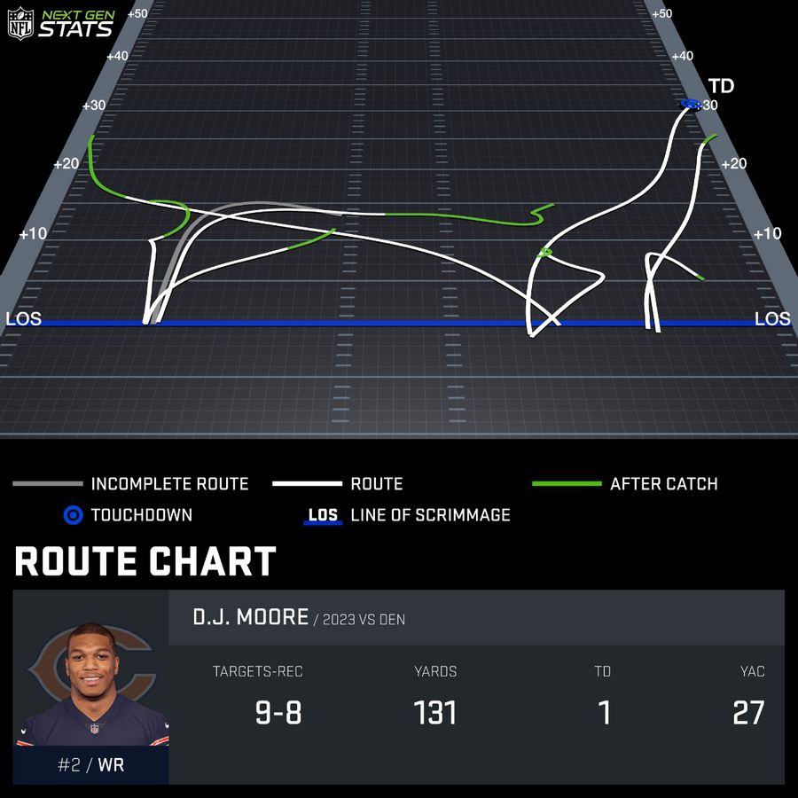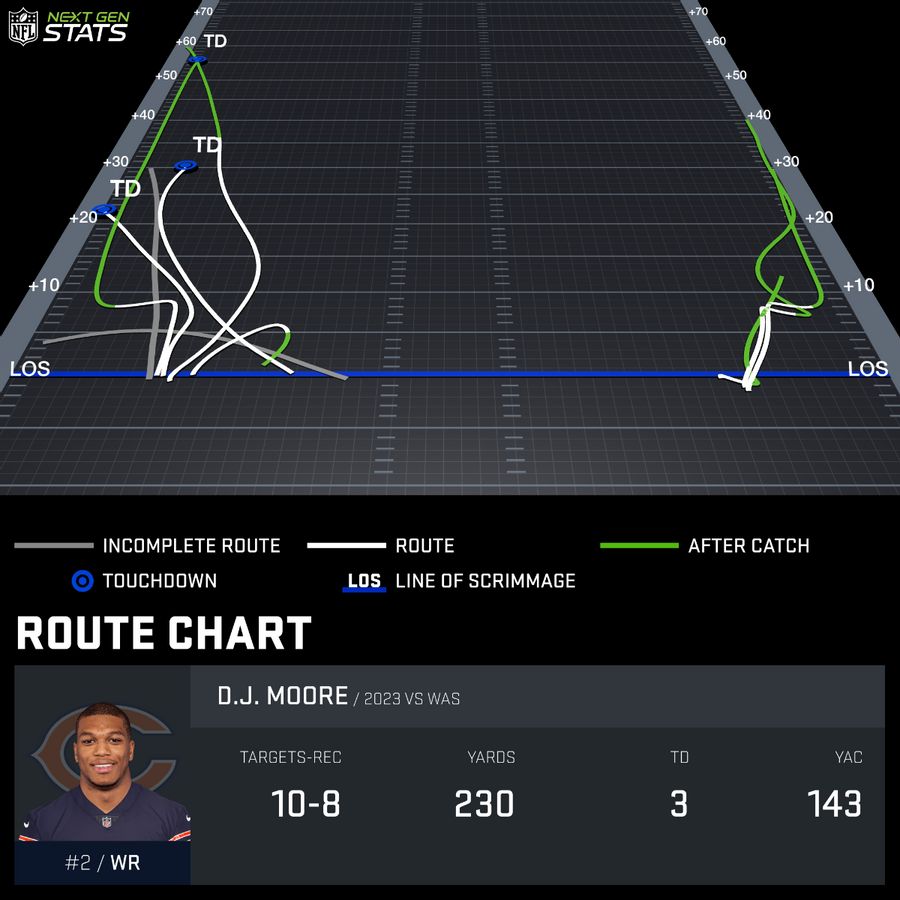 The Bears have force fed Moore the ball from Weeks 4-5 and got him involved in a different way in each game. Just look at his route charts from those two weeks, courtesy of Next Gen Stats.
