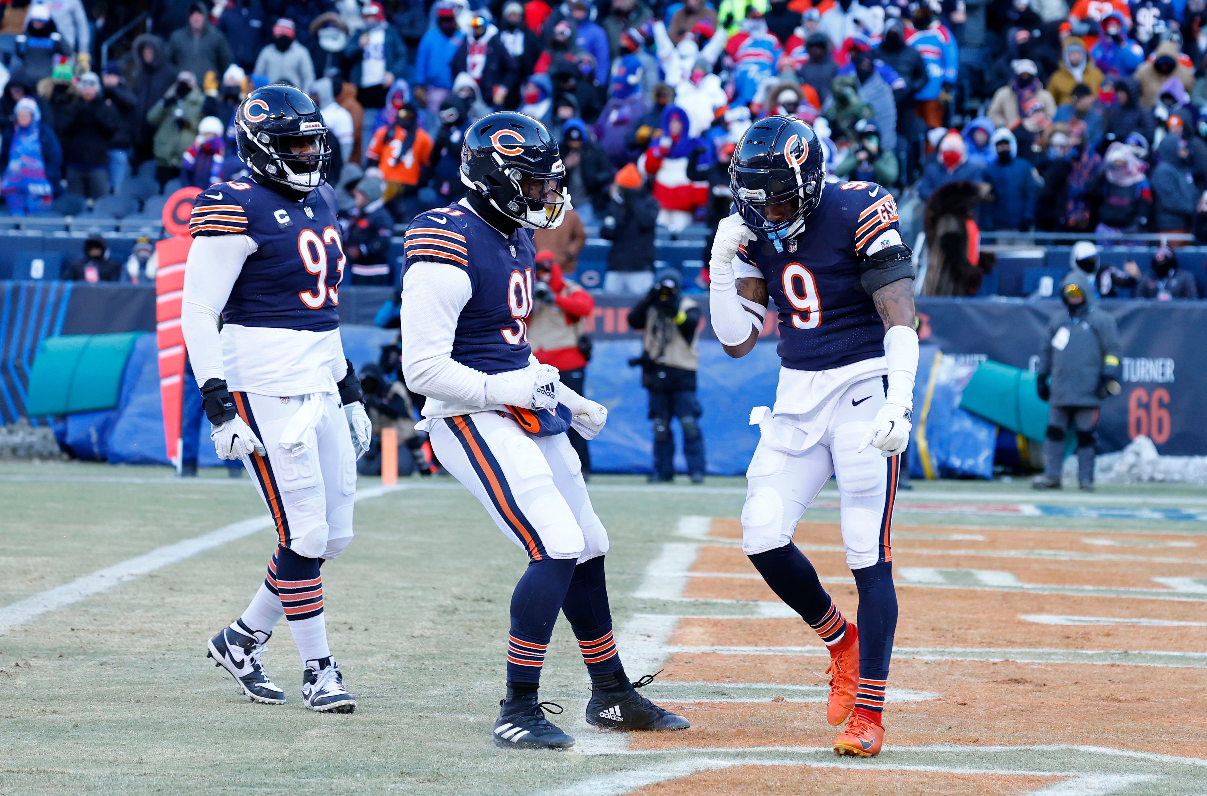 Nov 13, 2022; Chicago, Illinois, USA; Chicago Bears quarterback Justin Fields (1) celebrates with tight end Trevon Wesco (88) and wide receiver Byron Pringle (13) after he scores a touchdown against the Detroit Lions during the first half at Soldier Field.