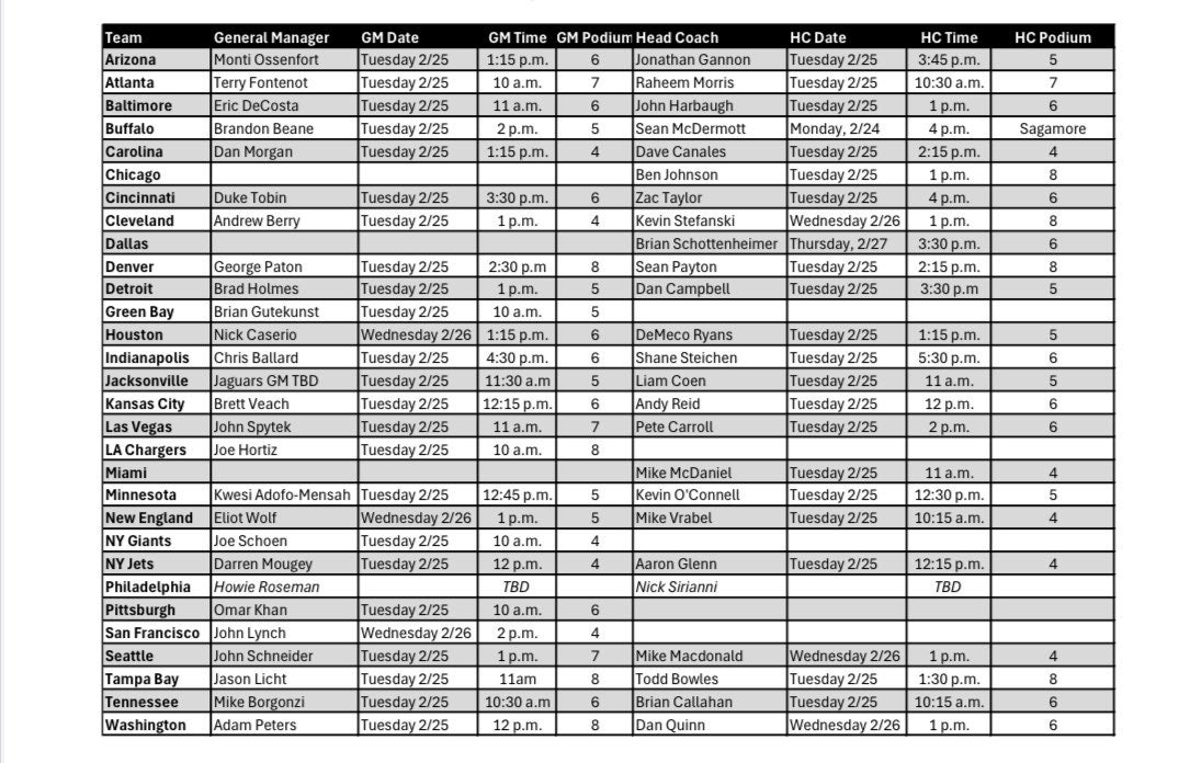 Below is the expected media availability schedule for the 2025 NFL Combine for various head coaches and general managers around the league, starting on Tuesday.