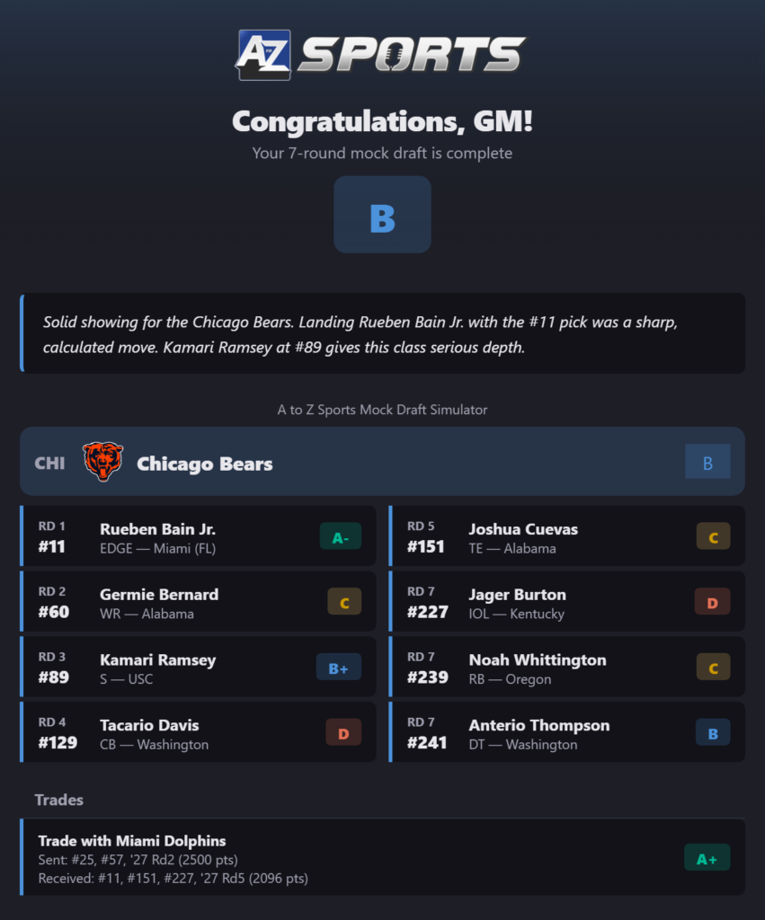 Hypothetically, let’s say Bain falls to 11 and the Bears make a move, here’s what this trade up could look like for all seven-rounds using the A to Z Sports Mock Draft Simulator.
