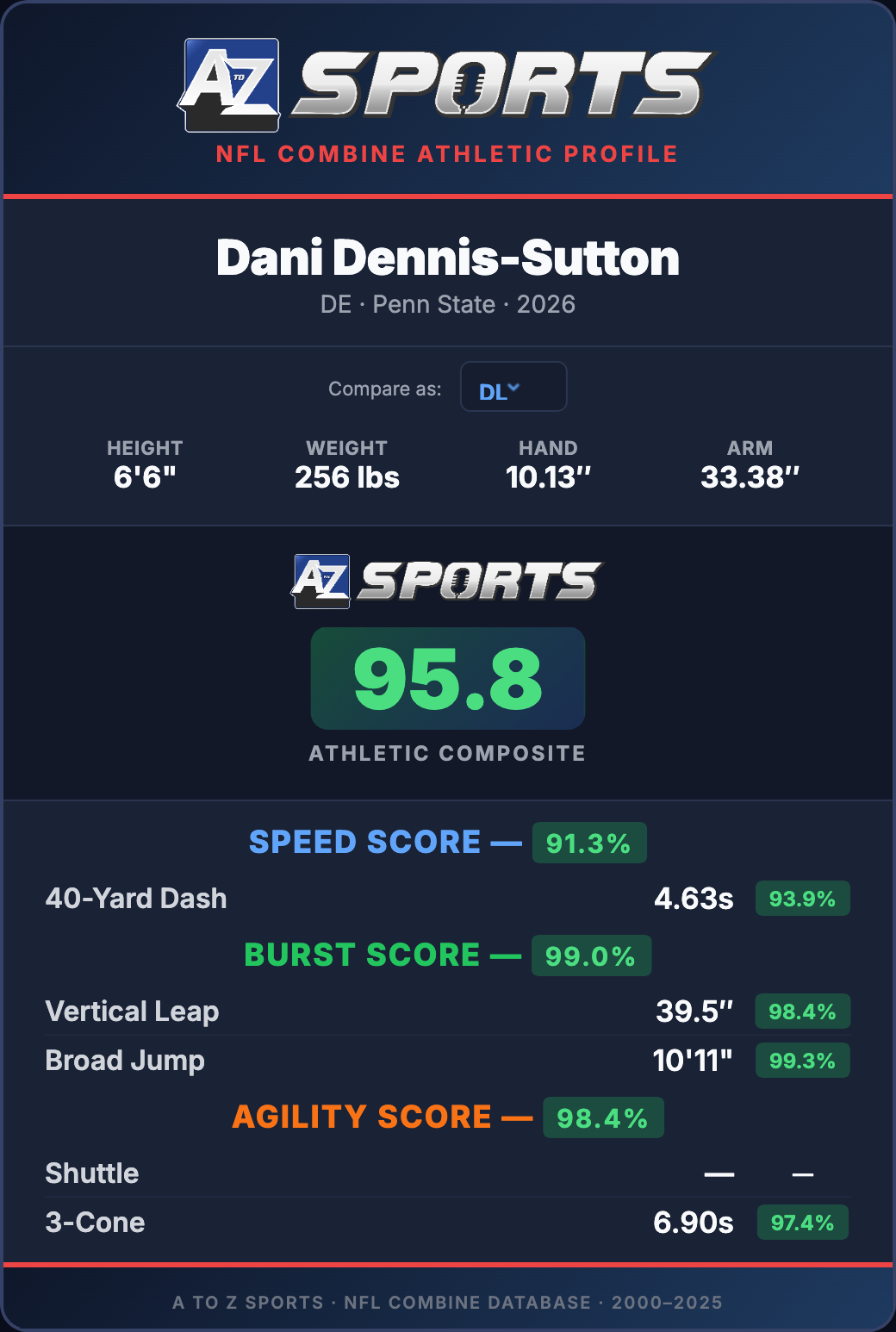 Enter Dani Dennis-Sutton, who also turned plenty of heads in Indianapolis. His vertical and broad jumps resulted in 99-percentile burst score, and with a 4.63 40-yard dash and 6.90 3-cone time, his all-around athleticism was on full display.