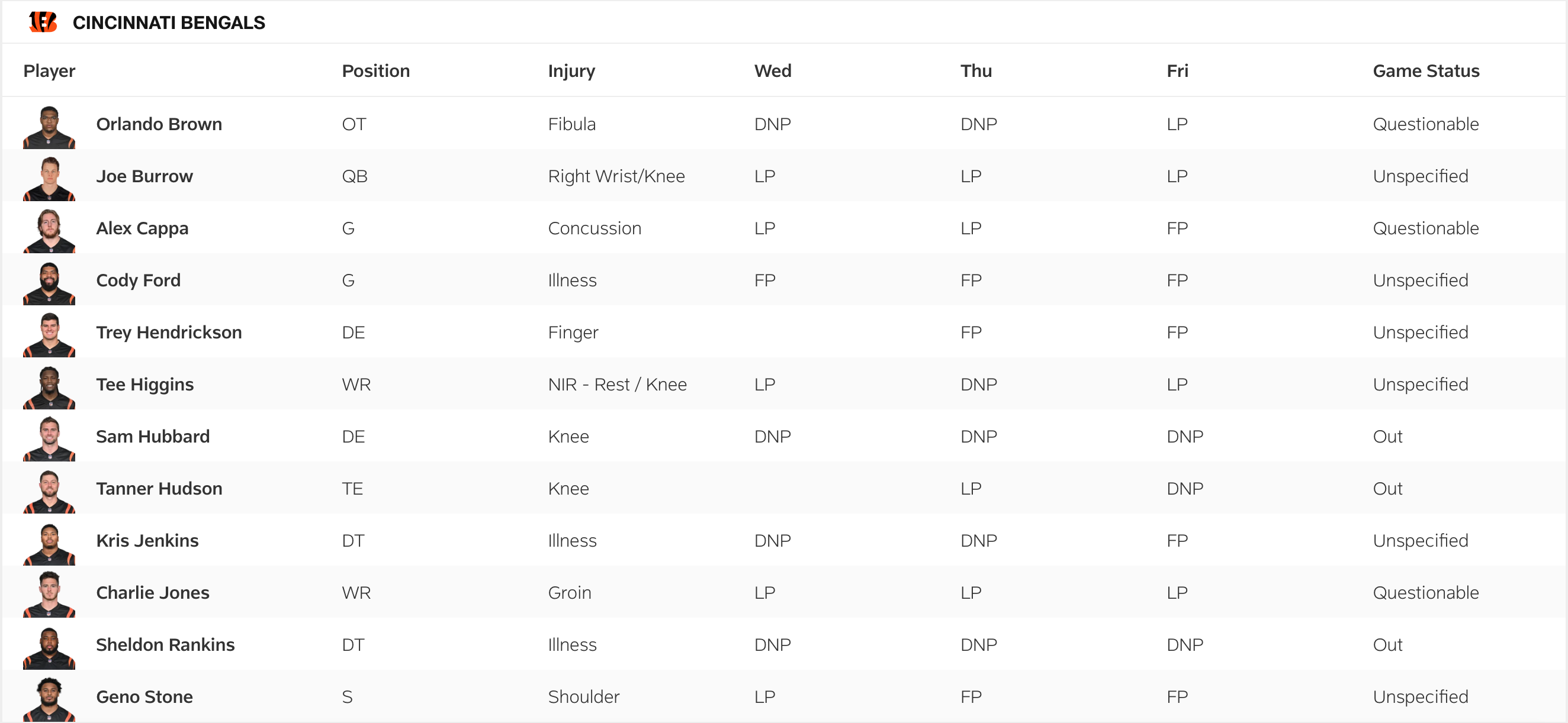 Bengals Friday Injury Report
