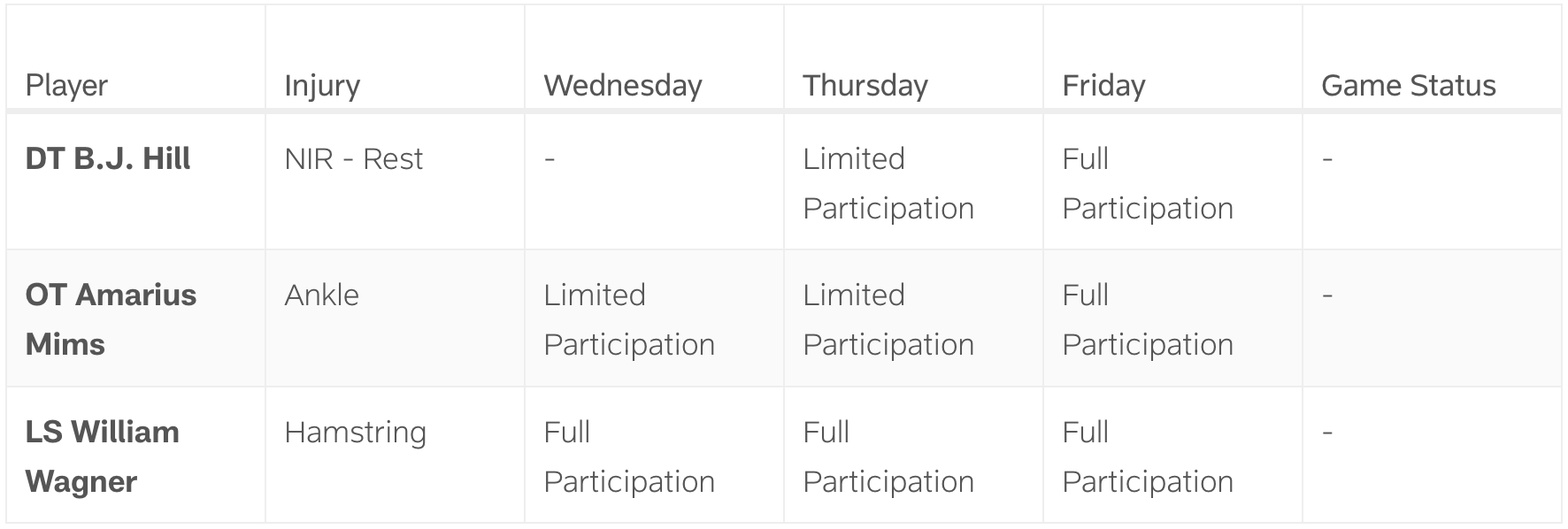 Defensive tackle B.J. Hill (rest), right tackle Amarius Mims (ankle), and long snapper William Wagner (hamstring) are all good to go for the game. Hill got a half-rest day on Thursday, Mims went limited Wednesday and Thursday, and Wagner didn’t miss any practice time.