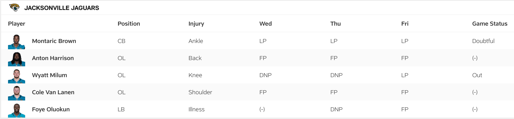 Offensive lineman Wyatt Milum (knee), who was inactive for Week 1 with the same injury, did not practice all week and is the only Jag that’s been declared out. Cornerback Montaric Brown (ankle) remained limited throughout the week and is considered doubtful to play.