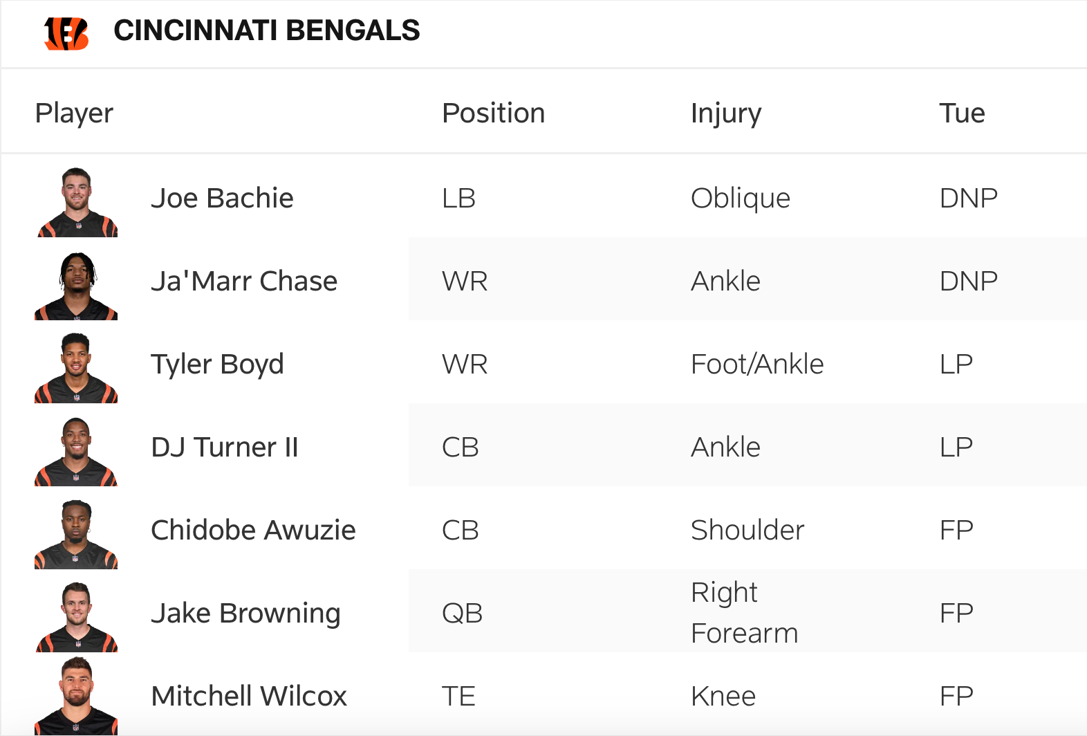 Speaking of Turner (ankle) and Boyd (foot/ankle), both would have been limited Tuesday. Cornerback Chidobe Awuzie (shoulder), quarterback Jake Browning (right forearm), and tight end Mitchell Wilcox (knee) would've all been full participants.