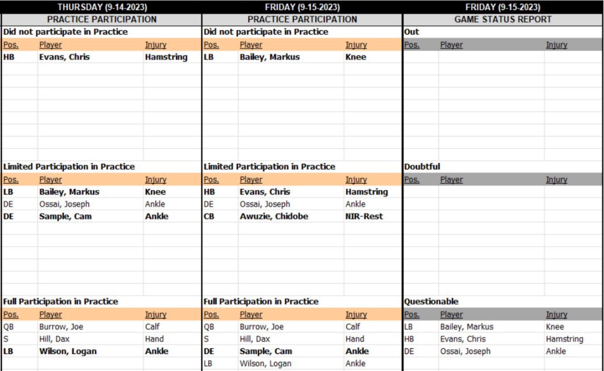 Bailey and Evans each missing one practice this week definitely puts their respective statuses in the air, and Ossai being limited all week also makes him a definitive game-time decision.