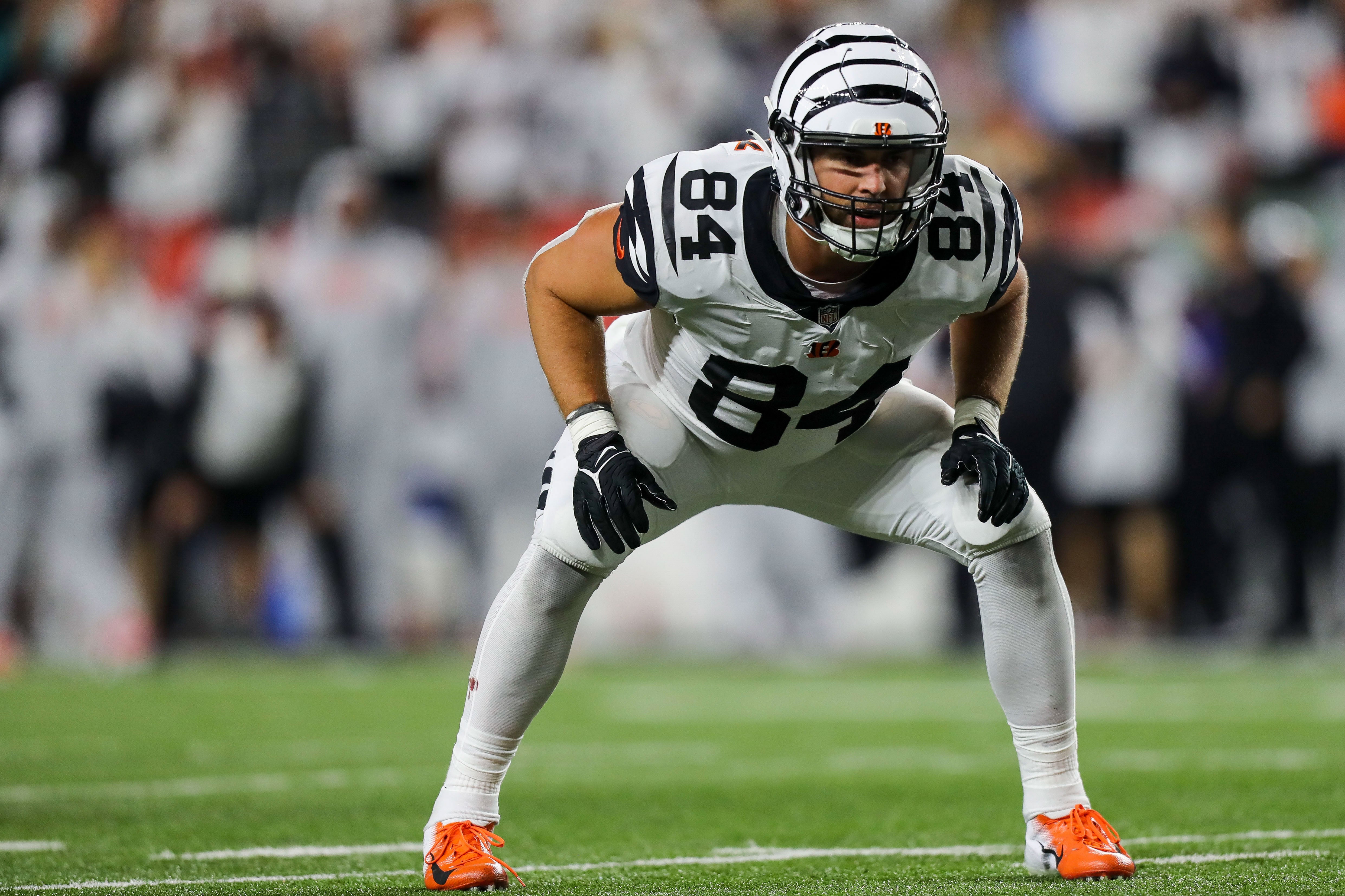 Sep 29, 2022; Cincinnati, Ohio, USA; Cincinnati Bengals tight end Mitchell Wilcox (84) during a field goal against the Miami Dolphins in the second half at Paycor Stadium. Mandatory Credit: Katie Stratman-USA TODAY Sports