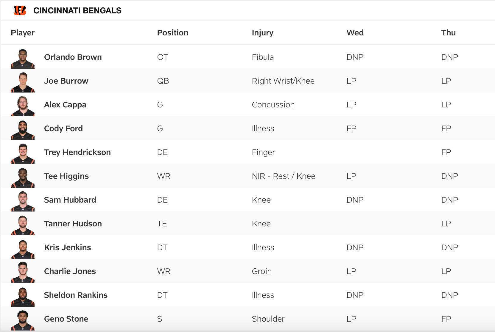 Quarterback Joe Burrow (wrist/knee), right guard Alex Cappa (concussion), and wide receiver Charlie Jones (groin) remained limited Thursday, and tight end Tanner Hudson (knee) popped up as limited.