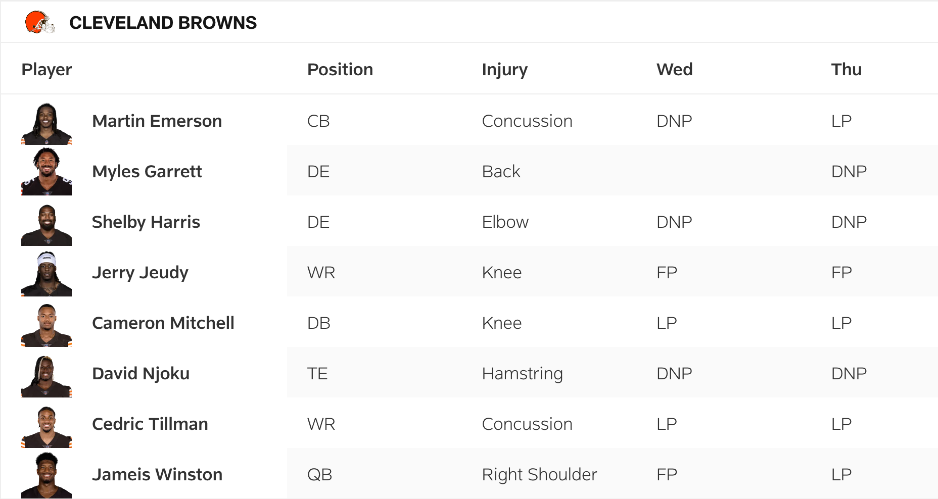 Defensive tackle Shelby Harris (elbow), tight end David Njoku (hamstring) remained out. also DNPs Wednesday, cornerback Cameron Mitchell (knee) remained limited, and wide receiver Jerry Jeudy (knee) went full again. Backup quarterback Jameis Winston (right shoulder) was downgraded to limited.