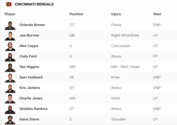 Quarterback Joe Burrow (wrist/knee) and wide receiver Tee Higgins (knee) had their typical limited practices, although Higgins' knee listing is new this week. Right guard Alex Cappa (concussion) remains in the concussion protocol, but practicing at all to start the week is a good sign for him to play on Sunday.