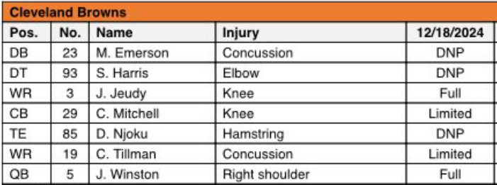 Cornerback Martin Emerson Jr. did not practice and wide receiver Cedric Tillman was limited as they're both dealing with concussions this week. Defensive tackle Shelby Harris (elbow) and tight end David Njoku (hamstring) were also DNPs Wednesday.