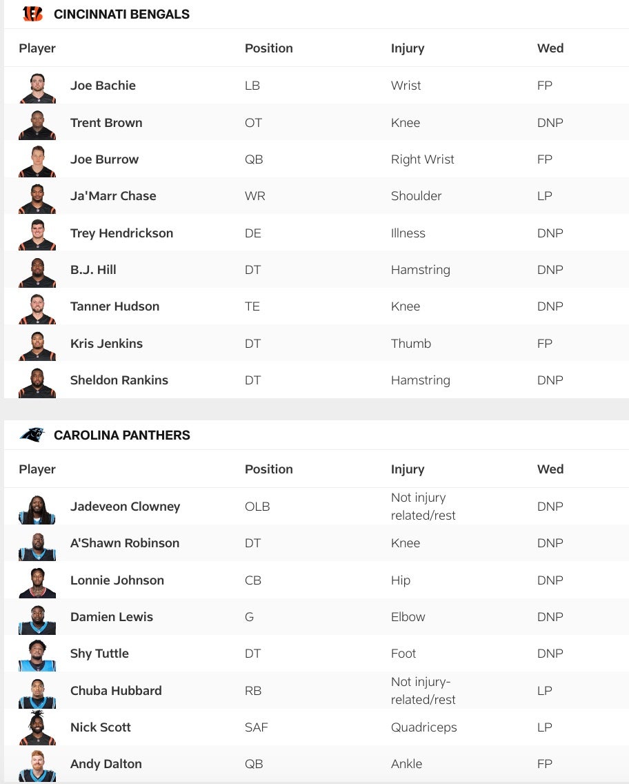 Bengals vs Panthers Wednesday Injury Report