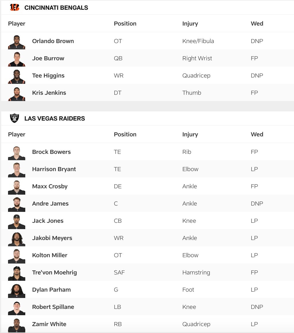 Bengals vs Raiders Wednesday Injury Report