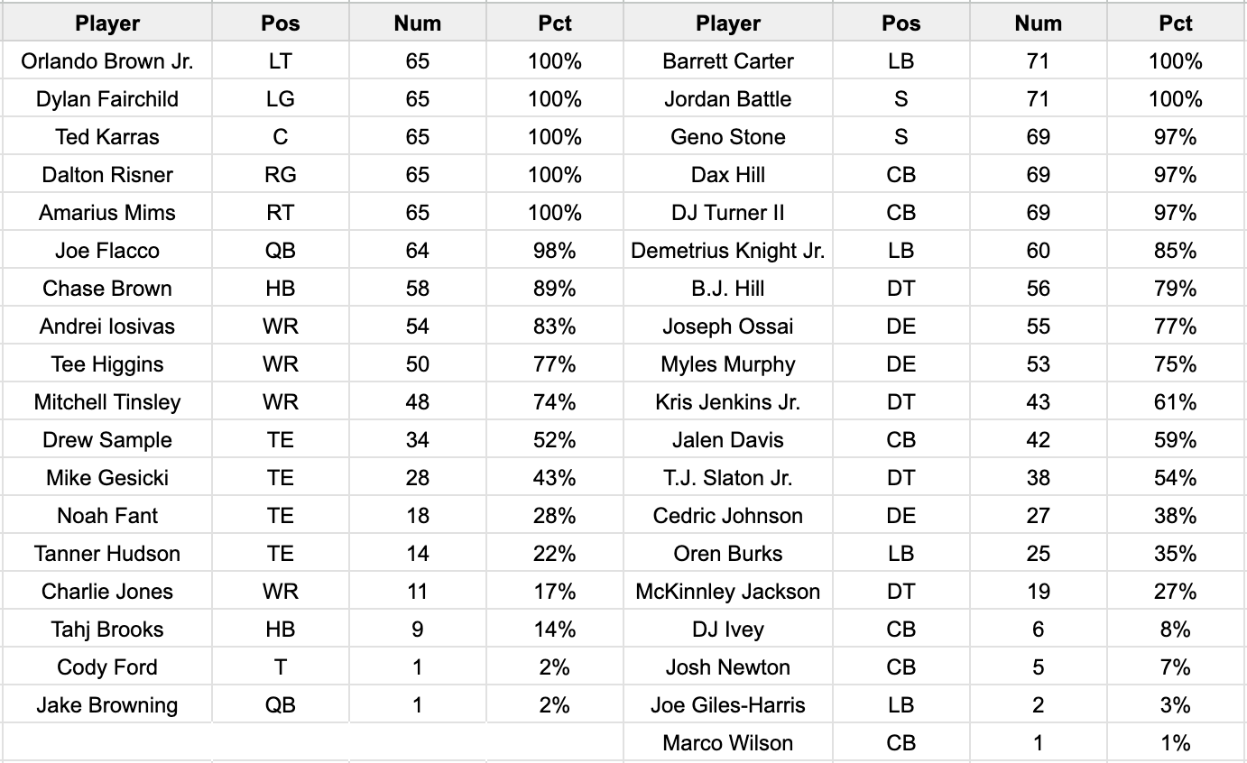 Let’s see what the snap counts had to say about the Cincinnati’s loss to the Patriots.