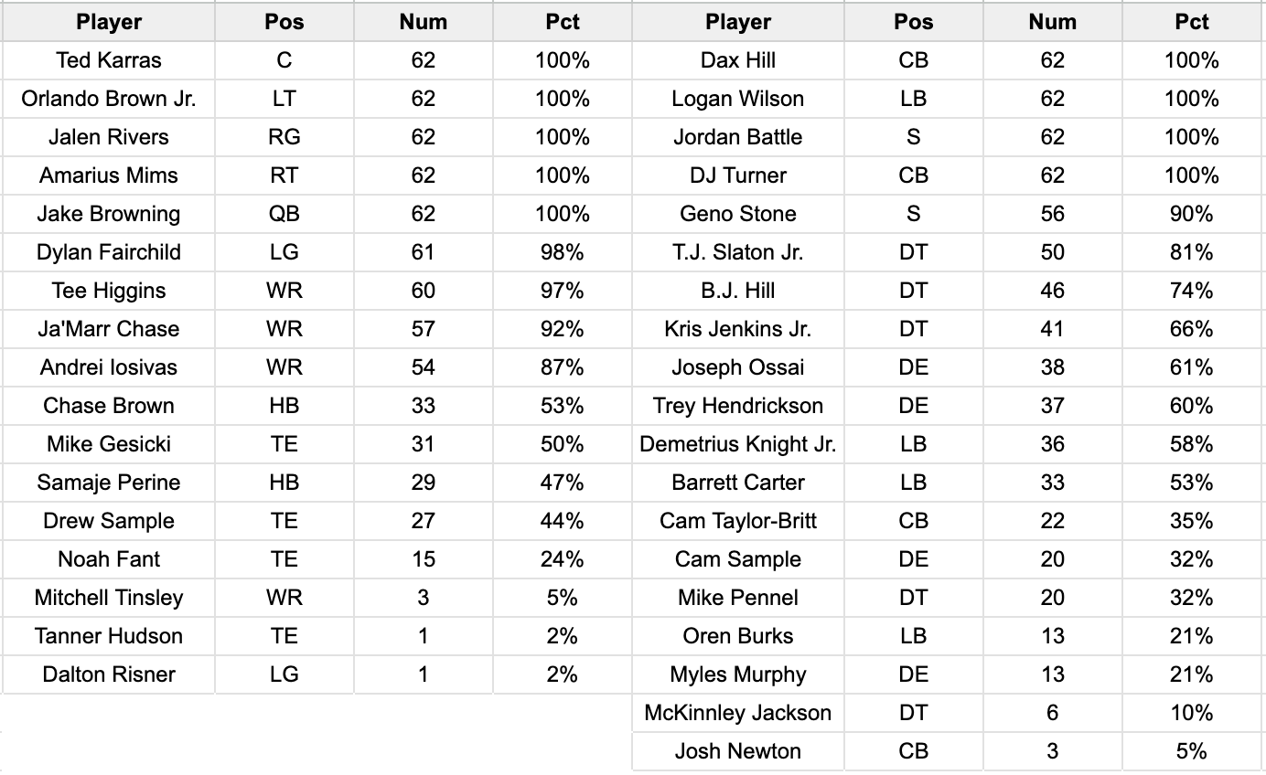 - Chase Brown (33) and Samaje Perine (29) were a near equal split in the backfield at running back. Brown amassed the same yardage as Perine (27 yards) despite having eight to the latter’s four carries.