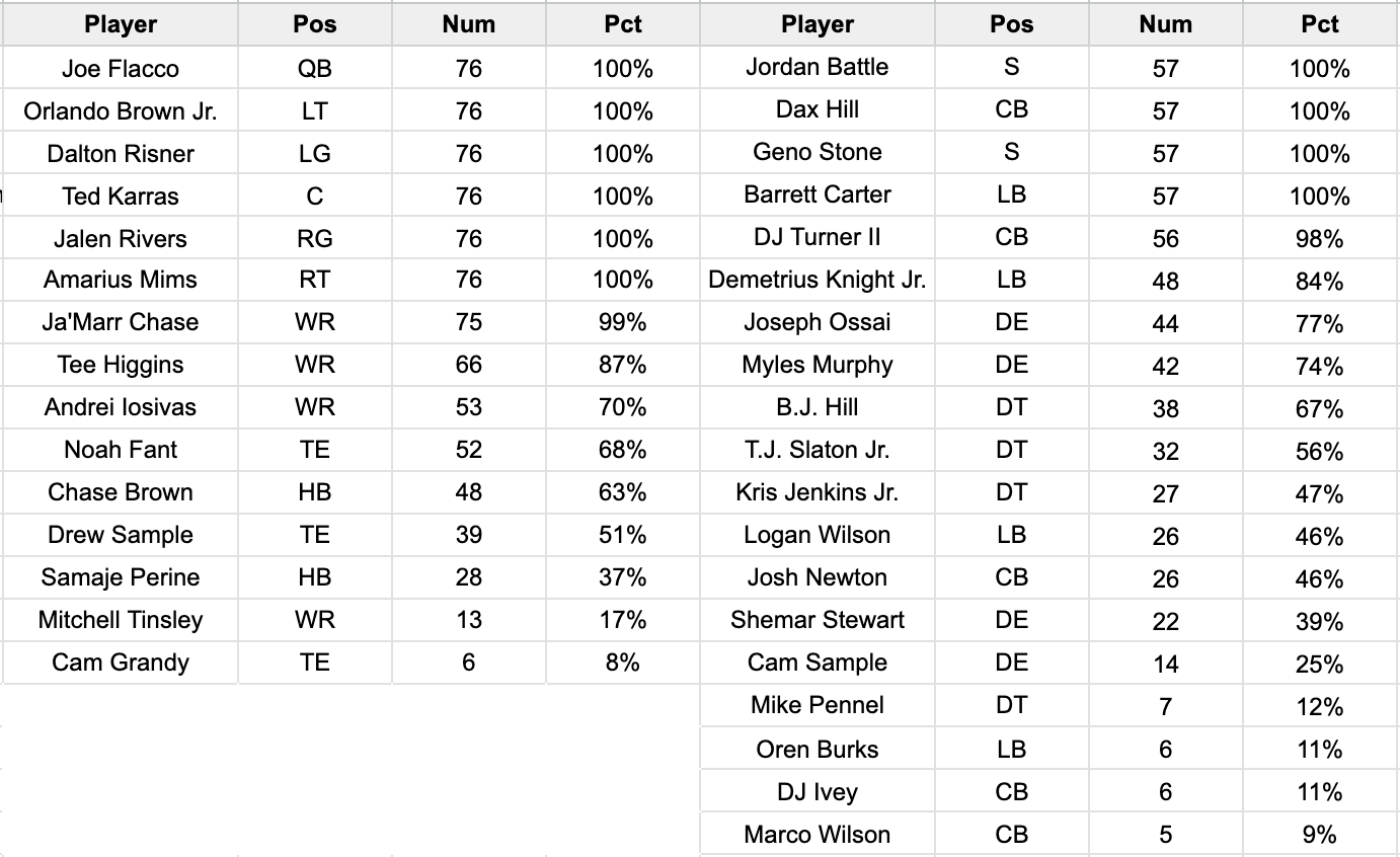 Mike Gesicki’s pectoral injury cleared the way for Noah Fant (52) to play the most snaps than he’s played in a Bengals uniform so far this year. Fant wasn’t technically the starter as Drew Sample (39) played the first snap and 38 more, but the passing attack under Joe Flacco’s (76) command featured Fant having the third-most passing snaps of anyone not named Flacco for Cincinnati.