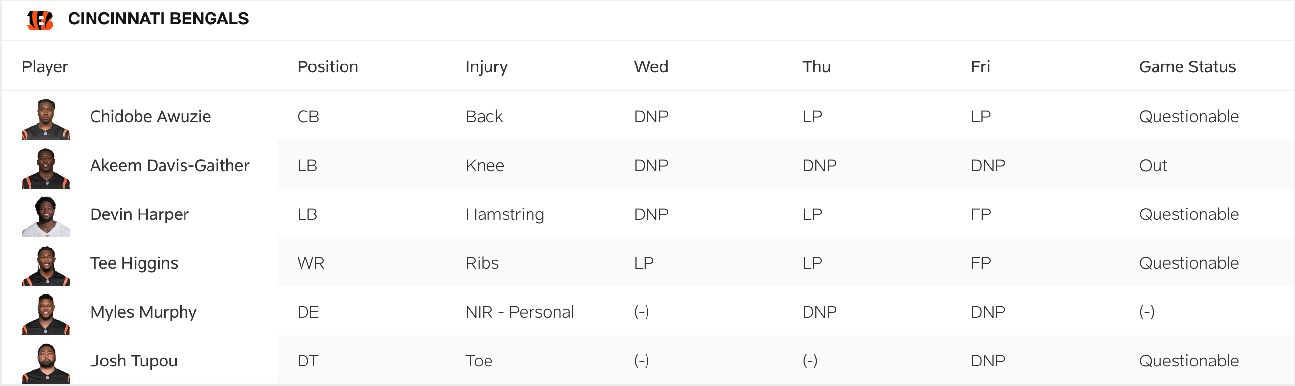 Bengals Final Injury Report For Week 6