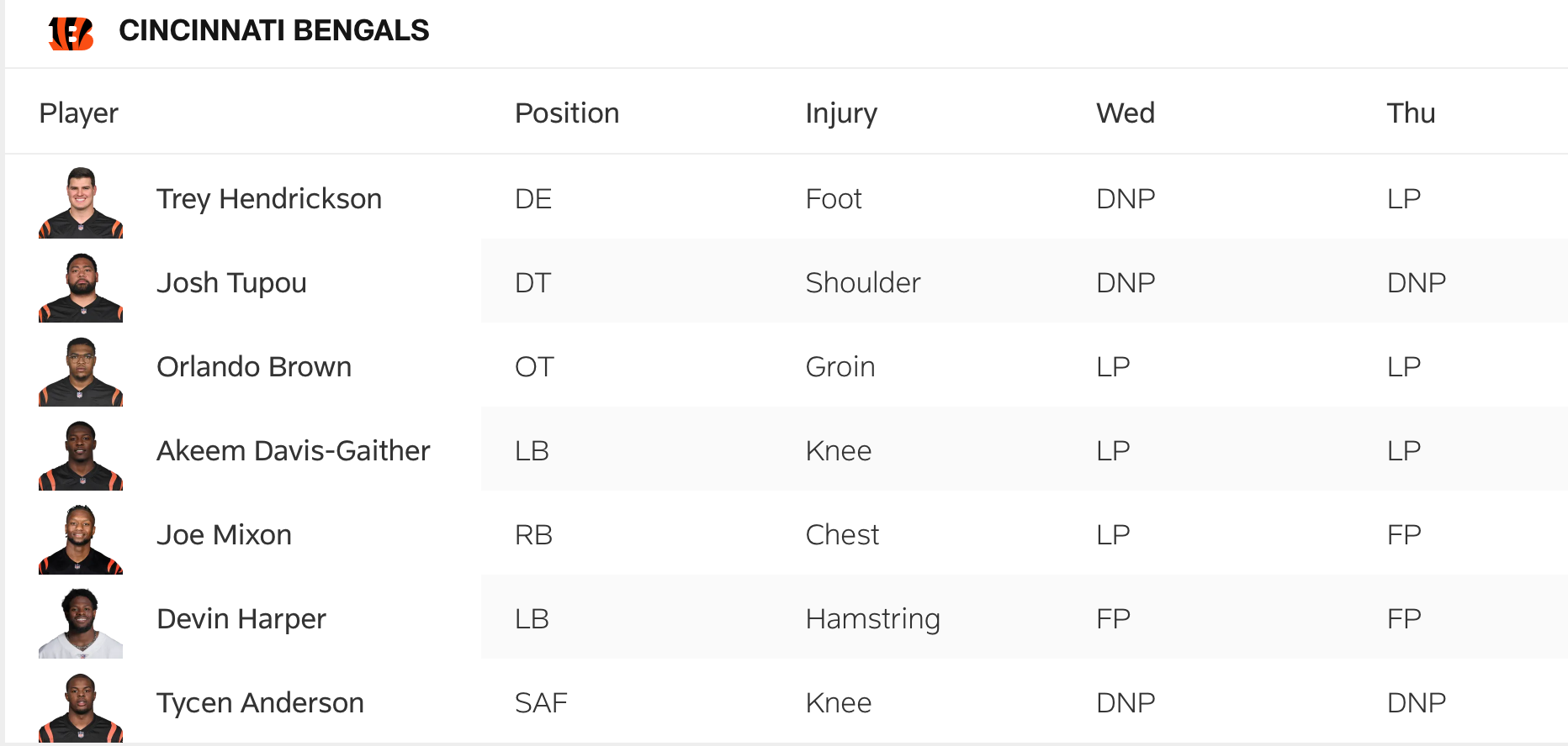 Also practicing Thursday is linebacker Akeem Davis-Gaither (knee), who's missed the past four games, and running back Joe Mixon (chest), who was limited on Wednesday along with Davis-Gaither. Mixon went full on Thursday.