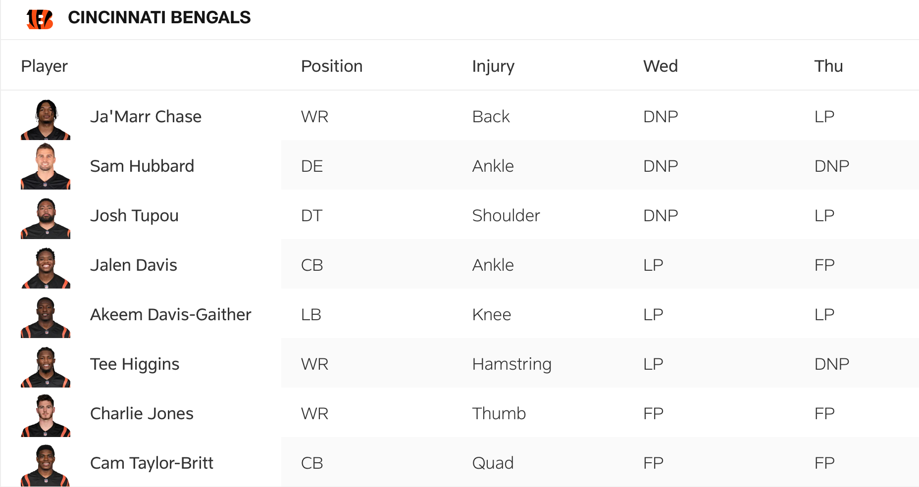 Thursday's practice for the Cincinnati Bengals is featuring just two of the offense's star receiver trio. Ja'Marr Chase (back) returned to practice after missing Wednesday's session, but Tee Higgins, who suffered a hamstring injury Wednesday, is not practicing. Chase fell hard on his back during Cincinnati's 24-18 victory over the Buffalo Bills on Sunday Night […]
