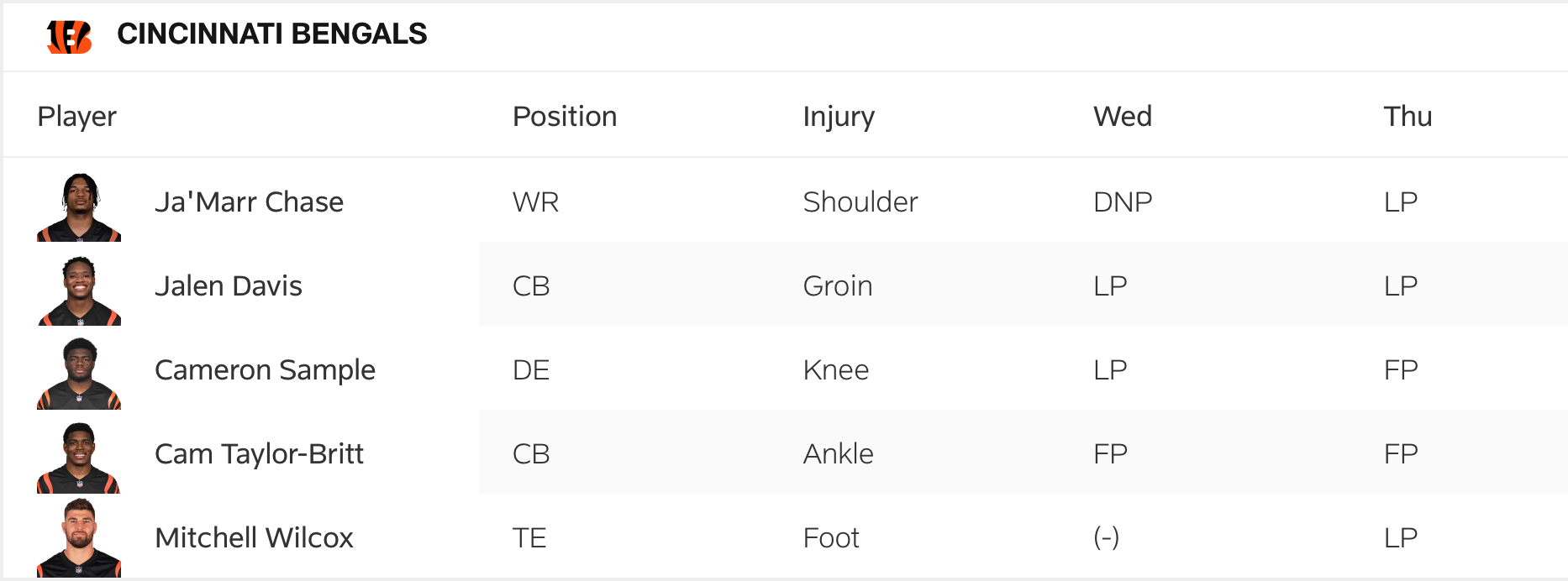 Chase was officially limited in his first practice back, as was cornerback Jalen Davis (groin) and tight end Mitchell Wilcox (foot). Wilcox was a full participant Wednesday, so this is a new injury for him.