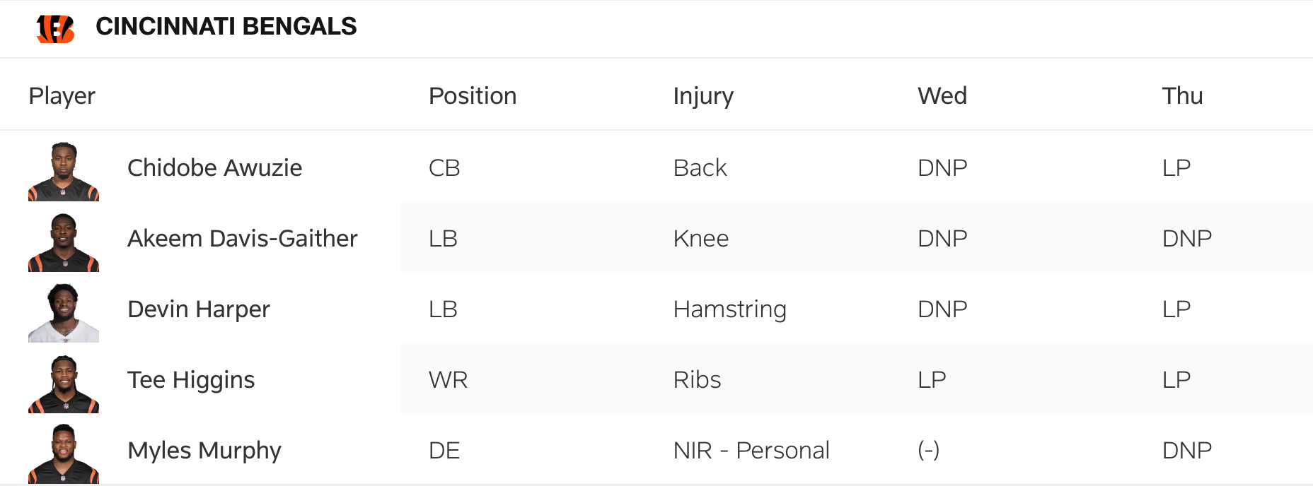 Starting wideout Tee Higgins (rib fracture) also got the day-to-day label from Taylor this week, but he's now practiced in back-to-back days in limited fashion. His status for playing Sunday looks promising with one practice remaining.