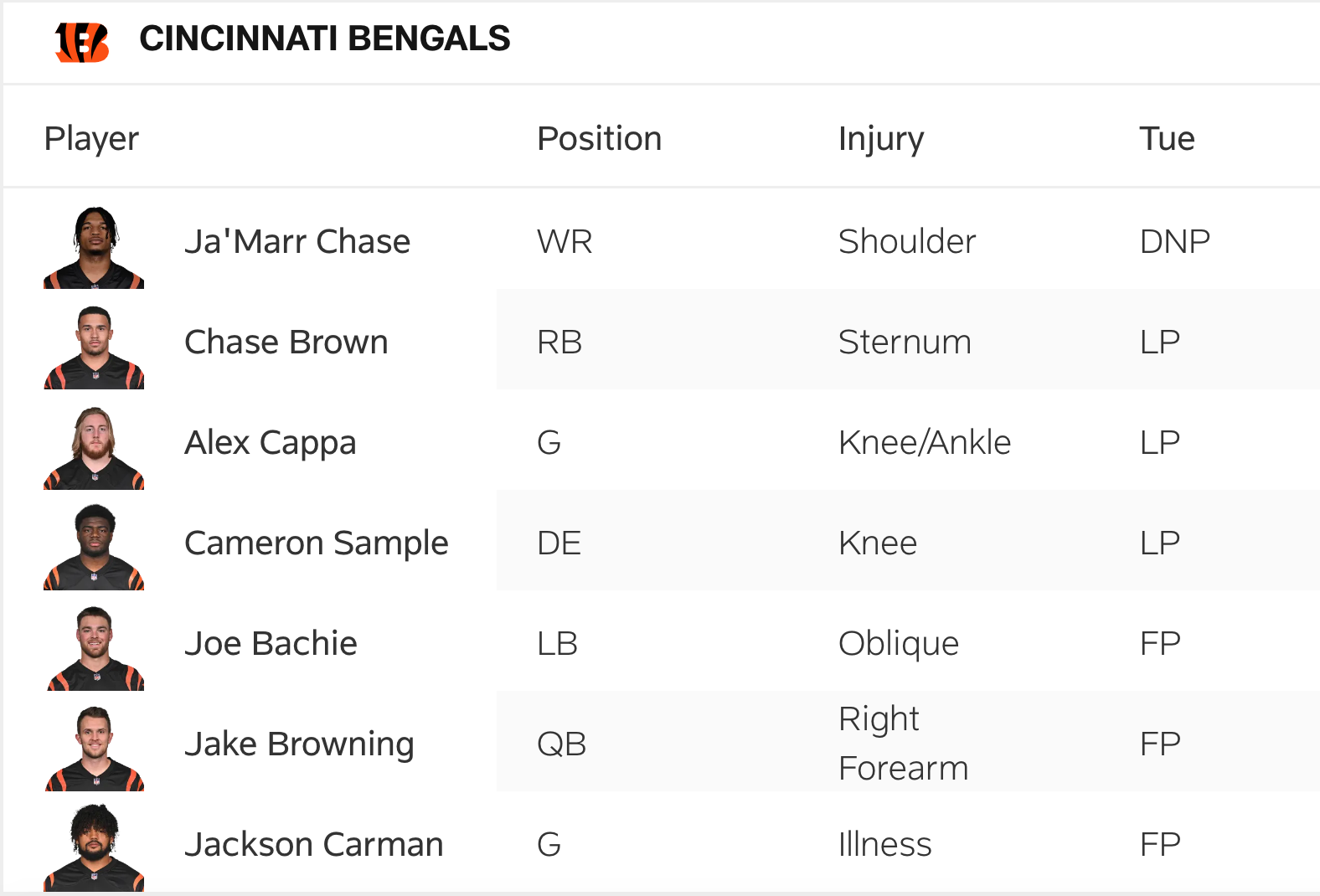 Running back Chase Brown (sternum), guard Alex Cappa (knee/ankle), and edge defender Cam Sample (knee) were all limited Tuesday. Cappa was notably injured during Week 15's win, but only missed four offensive snaps. The origins of Brown and Sample's injuries are unknown.