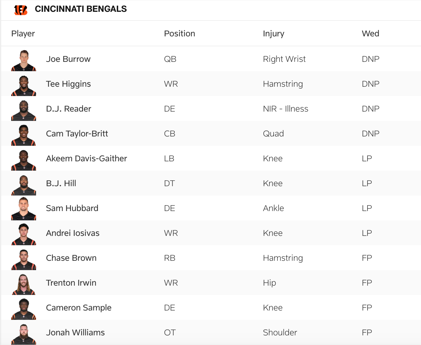 Along with Hubbard and Iosivas, Akeem Davis-Gaither and B.J. Hill were each limited Wednesday. Everyone else on the team was a full participant, including rookie Chase Brown, who was cleared to practice earlier this week.