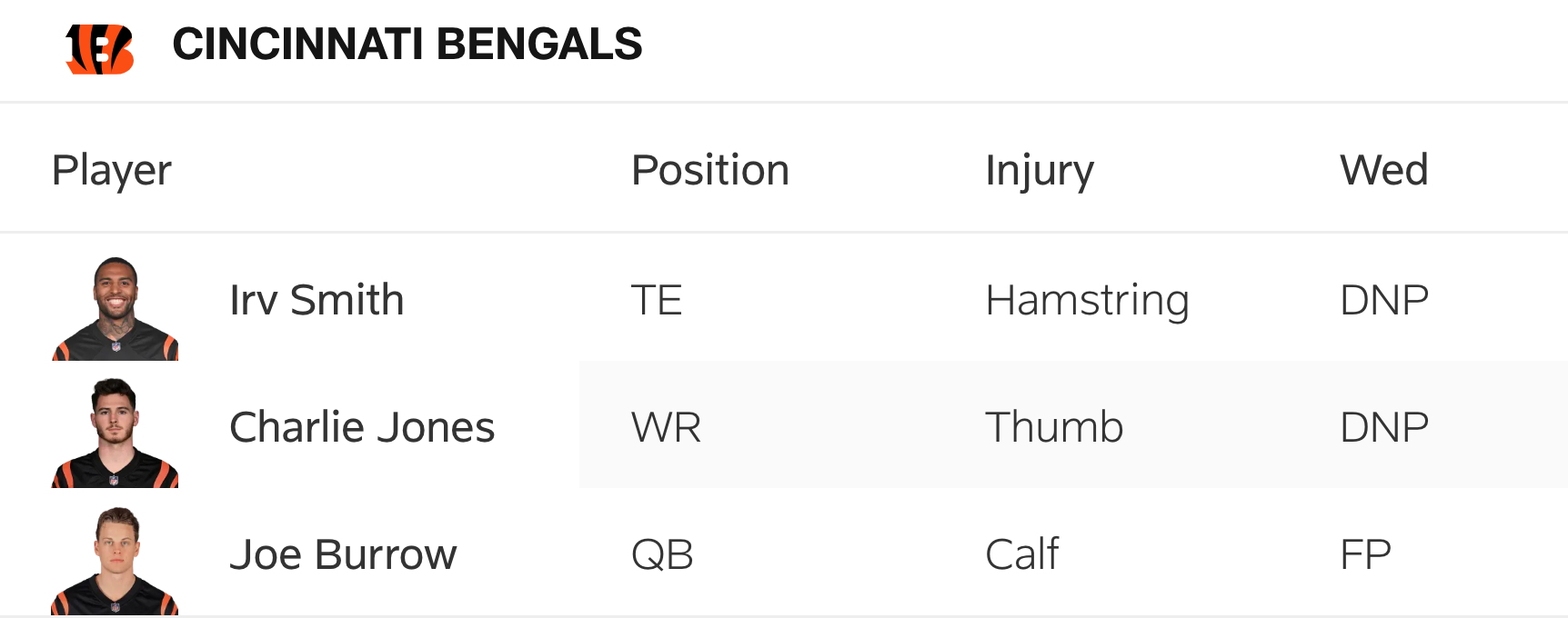 In the Bengals' first injury report for their upcoming game against the Tennessee Titans, Smith and Jones were listed as projected non-participants. Since it was just a walkthrough, their designations are just projections. It's a way of saying they would not have practiced if there was an actual session.