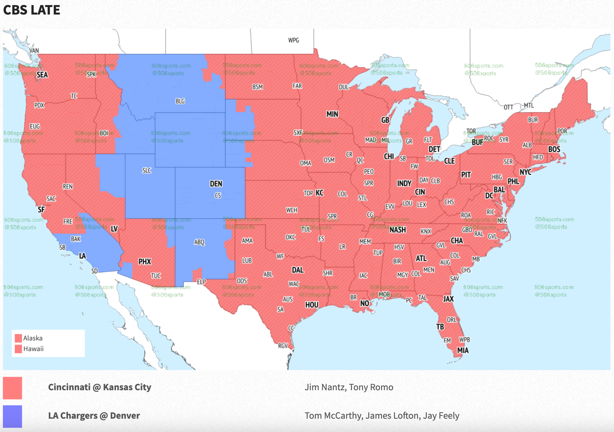 With the Denver Broncos hosting the Los Angeles Chargers at the same time, states in Mountain Time Zon like Colorado, Wyoming, and Utah will get that game on their local CBS station. The Los Angeles market is included as well.