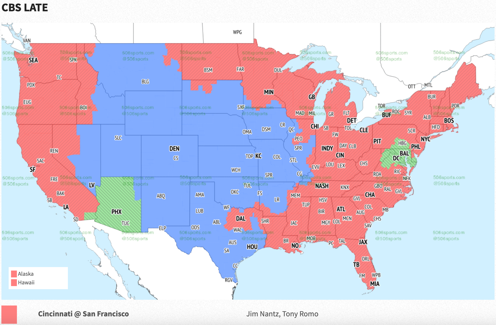 The late CBS window features three games with two of them spanning large portions of the country. The Bengals will be featured throughout almost all of the eastern time zone (aside from the greater Baltimore/DC area), most of the South, and good chunks of the upper midwest. They'll be featured in all three west coast states bordering the Pacific Ocean as well.