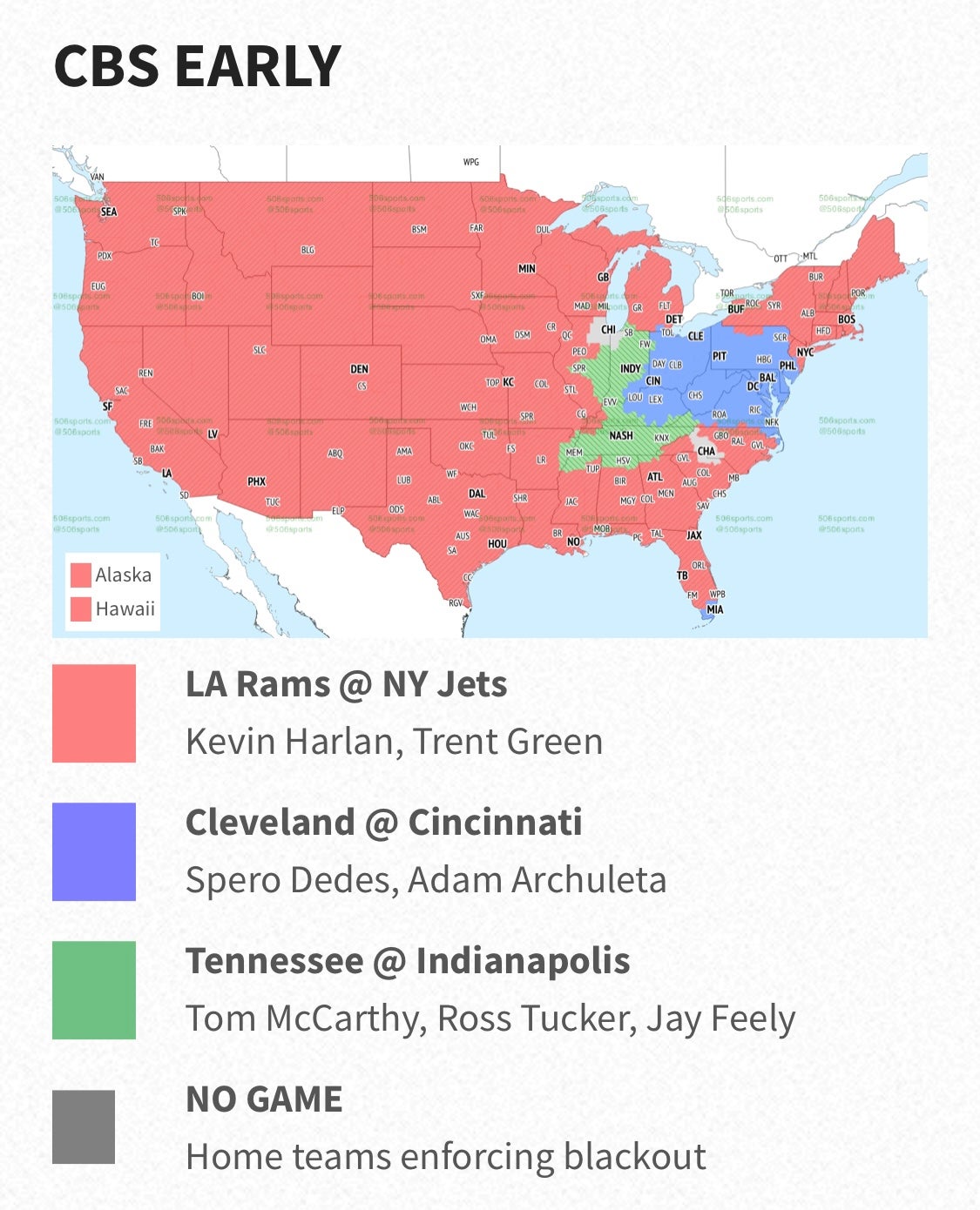 If you live in the blue area on the map above you are in the viewing area to see the game on CBS. It is basically the AFC North part of the country that will be able to see the game.