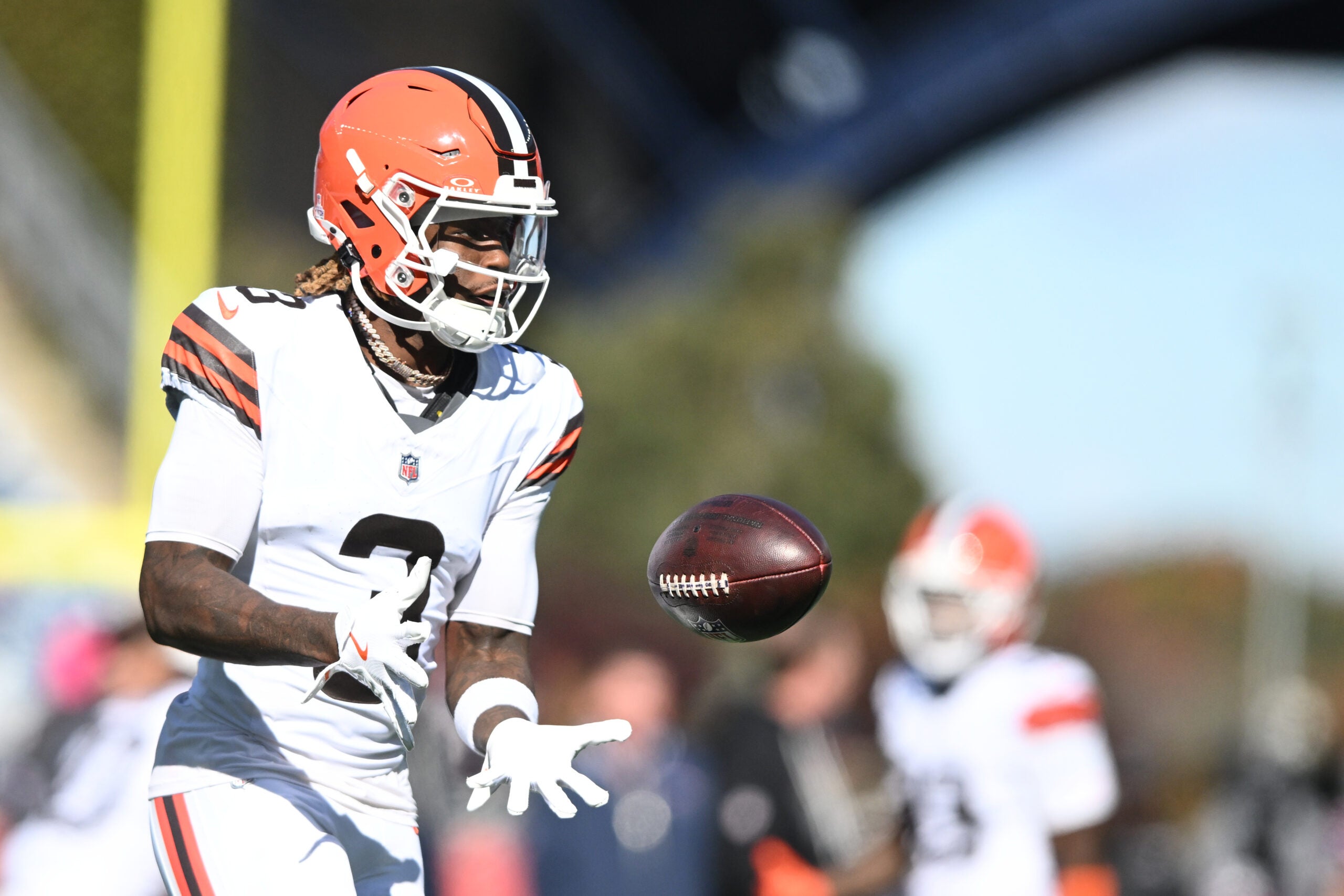 Oct 26, 2025; Foxborough, Massachusetts, USA; Cleveland Browns wide receiver Jerry Jeudy (3) warms up prior to the first half against the New England Patriots at Gillette Stadium. Mandatory Credit: Brian Fluharty-Imagn Images