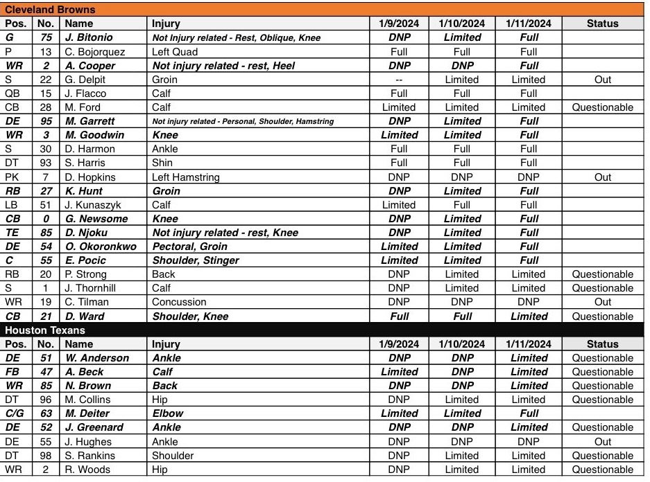 Questionable for Cleveland is CB Denzel Ward, CB Mike Ford, RB Pierre Strong, and S Juan Thornhill.