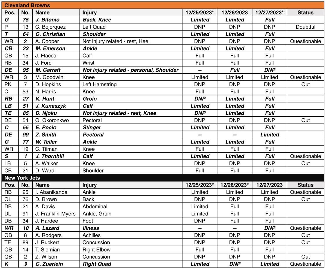 Due to that, Cleveland will be without K Dustin Hopkins (hamstring) and likely P Corey Bojorquez (quad) who is doubtful to play against the New York Jets on Thursday Night Football.