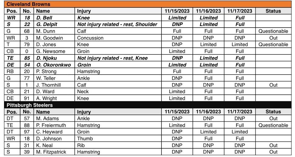 Week 11 Final Injury Report: Browns will be short handed on offense and defense vs. Steelers