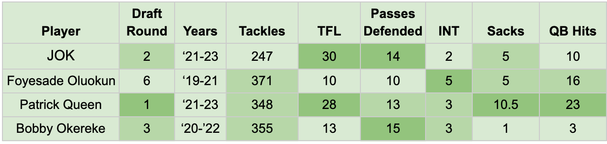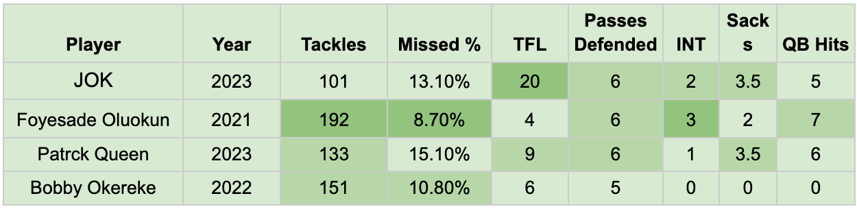 The nine missed games for the first two years of JOK’s career hinder his tackle count, but he still leads the group with the highest tackles-for-loss. His pass break-ups ranks second on the list, and even though he has the lowest interception count, it’s right in there with Patrick Queen and Bobby Okereke.