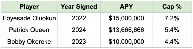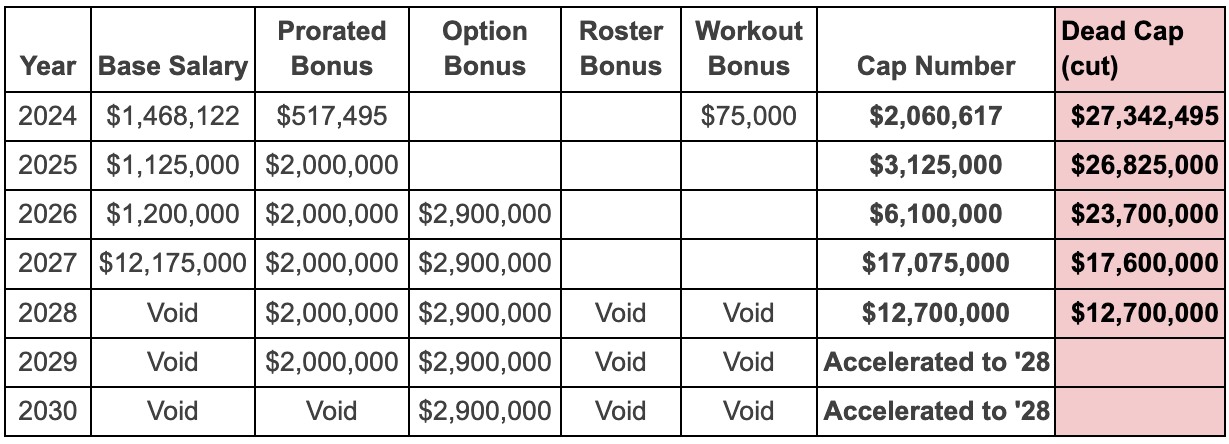 The contract below suggests a 5.09% cap share valuation, spreading out both a $10,000,000 signing bonus and $14,500,000 guaranteed option bonus in 2026 to the maximum five years each. By guaranteeing the first two years of minimal base salaries, that puts JOK at $26,825,000 in fully-guaranteed money. It’s a punitive percentage against his $39,000,000 contract, but a necessary concession for keeping an ascending player in his prime a year further removed from his next negotiation.