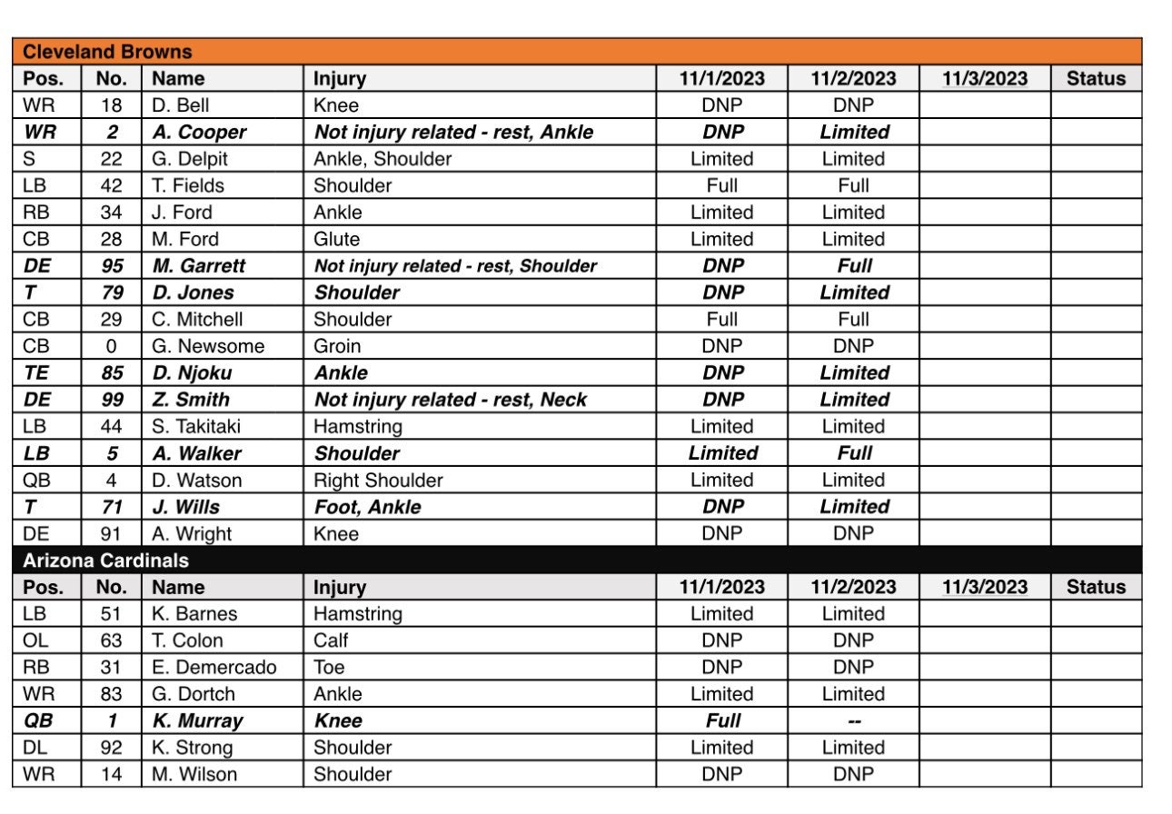 Cleveland Browns continued to practice on Thursday in preparation for the Arizona Cardinals in Week 9, so that means more injury updates.