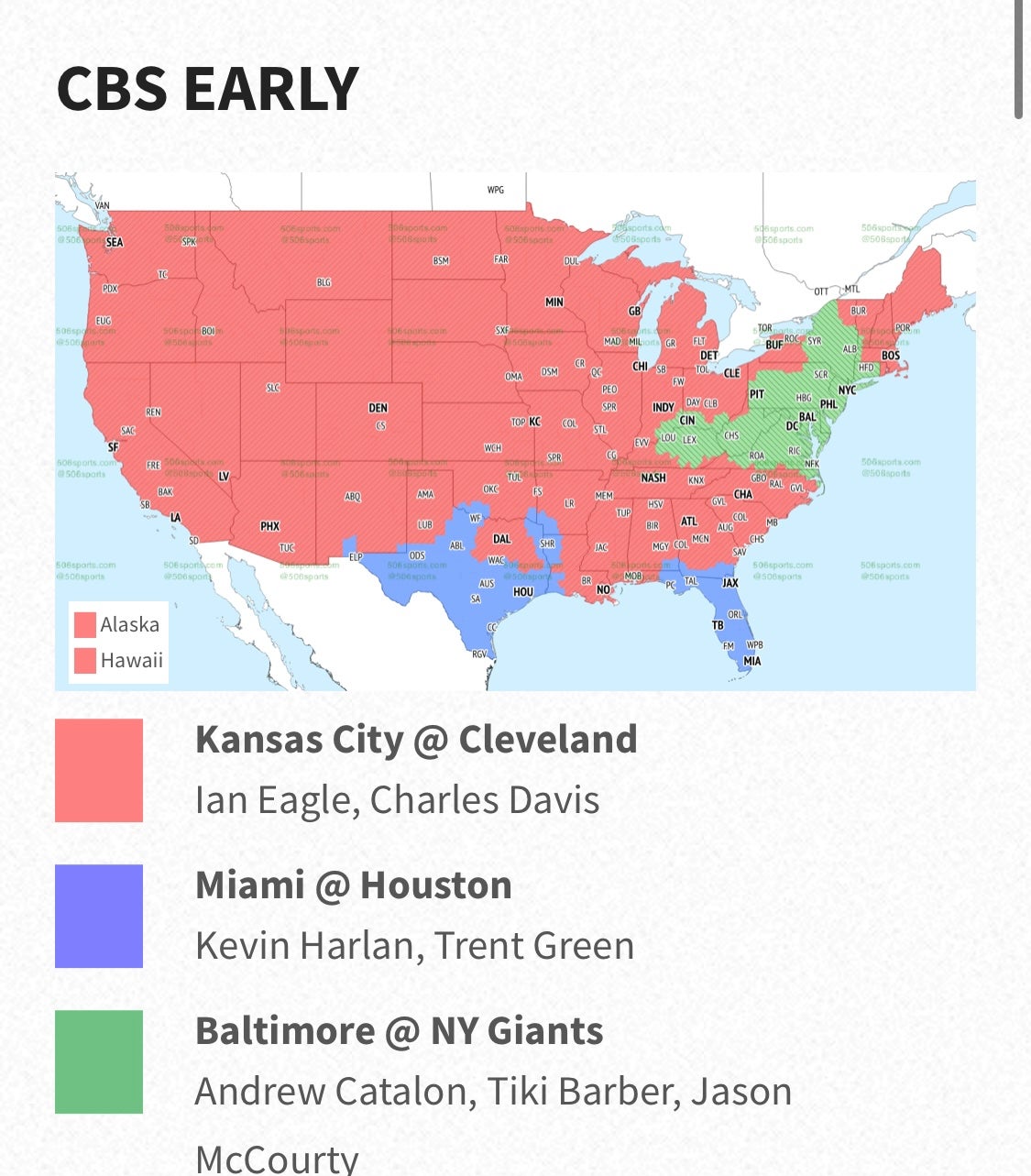 Much of the country is going to be able to watch this game, as it is the main CBS game for the early games. Everyone under the red-shaded area will be able to watch the matchup. Unless you are in Texas, Florida, New York, Pennsylvania, or Kentucky you will likely be able to view the game.
