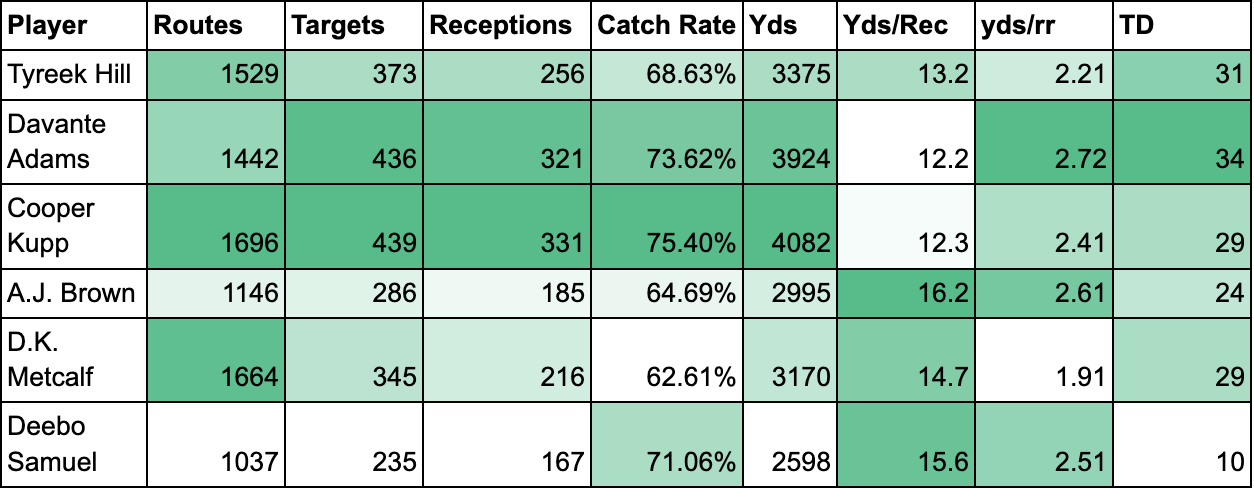 This group can be bisected into two distinct sub-sections. The first (Hill, Adams, Kupp) were all veterans already working on a non-rookie contract. All three had sustained top-of-the-league production over a multiple year stretch. The second were young receivers who were coming up on the end of their rookie deals who didn’t have the volume production of the first three, but their efficiency metrics (yards per route run) were off the charts.