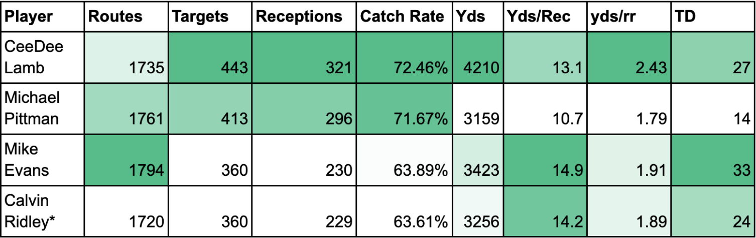 CeeDee Lamb’s 2021-2023 production vs. the above players’ 2019-2021 production