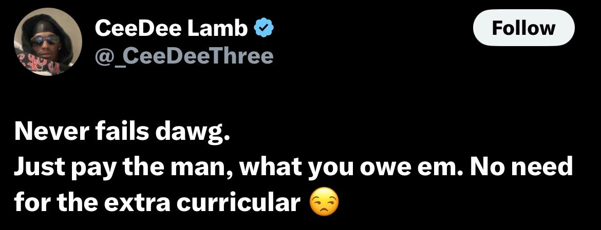 “Never fails dawg. Just pay the man, what you owe em. No need for the extra curricular” — Lamb via X/Twitter
