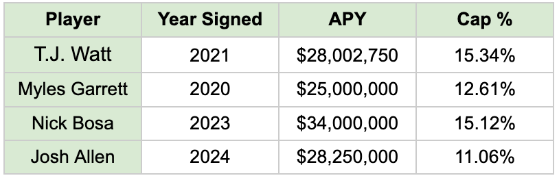 When T.J. Watt signed his extension in 2021, it was unclear whether his cap share significantly surpassed Myles Garrett’s valuation because of the contracted salary cap following the COVID year, or if the significant statistical differences between Watt and Garrett’s preceding three years simply boosted his value. The answer came in 2023, when Nick Bosa signed a $34 million APY contract after three years of play that surpassed Watt’s in most counting statistics.