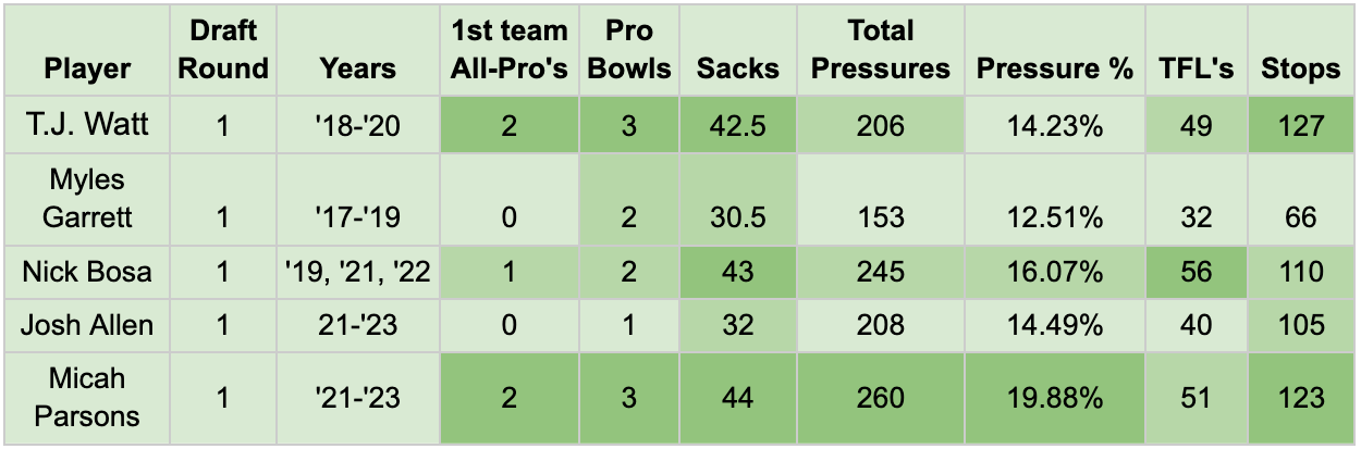 If we look at the premiere edge rushers with the highest percentages of cap share retroactive to the date of their extension, and accumulate their stats for the three seasons prior to their extension, Micah Parsons is a clear standout in the group: