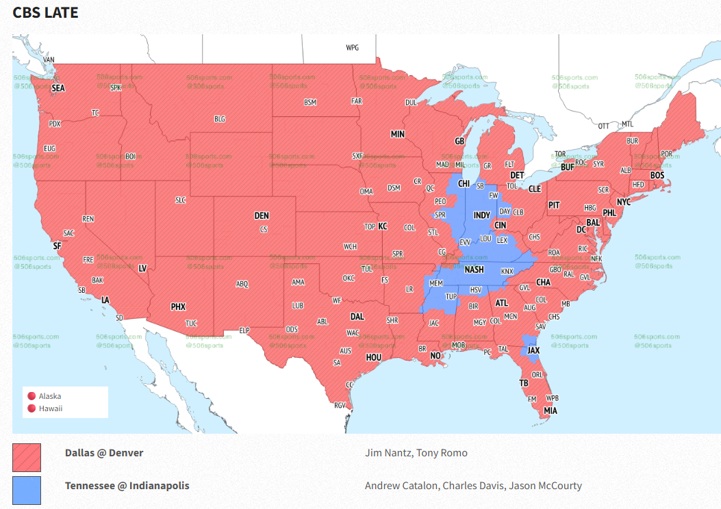 The red on the map indicates where in the country you’ll be able to watch the Broncos and Cowboys game, while the blue represents the competing game in the Tennessee Titans against the Indianapolis Colts. Needless to say, the Broncos are taking over the country.